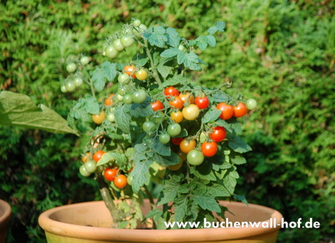 Wer wenig Platz hat und sich trotzdem im Tomatenanbau versuchen möchte, ist mit der Sorte 'Minibel' mehr als gut beraten. Ihre Wuchshöhe beträgt ca. 20cm und im Verhältnis zur Größe ist der Ertrag erstaunlich hoch. Sie produziert etliche süße Kirschtomaten, die zum Naschen einladen. 'Minibel hat eine kurze Entwicklungsdauer und so ist es möglich, sie noch bis zum Mai auszusäen.