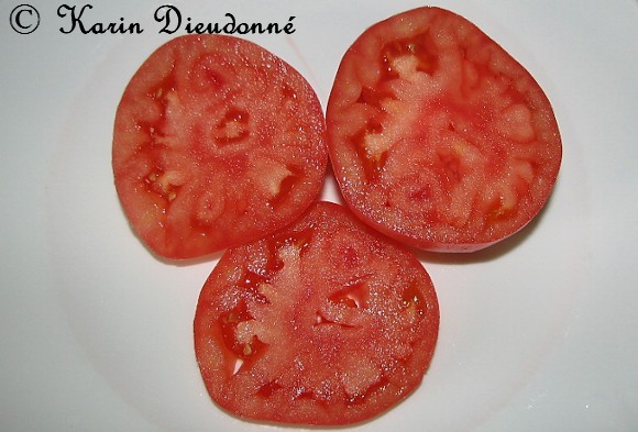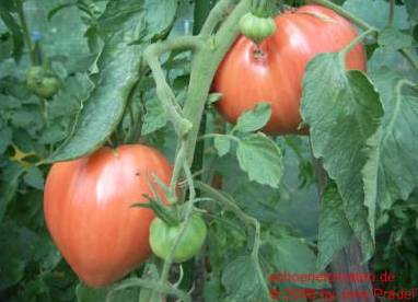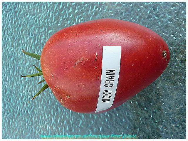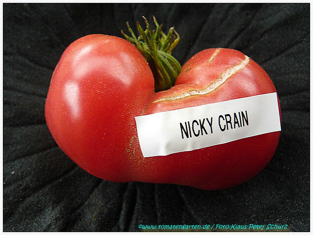 Nicky Crain - sehr große Pflanze (über 2,5 m) mittelfrüher Erntebeginn (Mitte August) außerordentlich ertragreich riesengroße, herzförmige (rund mit stumpfer Spitze) und ganz leicht gerippte, rote Früchte größte geerntete Frucht: 883 g ausgezeichneter Geschmack, sehr fleischig, saftig eine hervorragende Sorte, einfach köstlich! (Quelle: www.schoenetomaten.de)