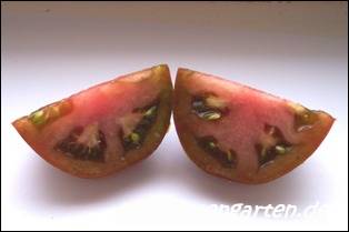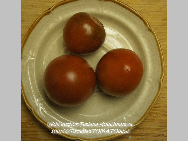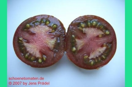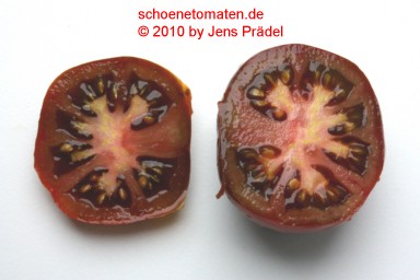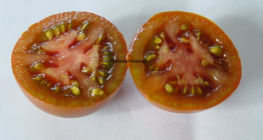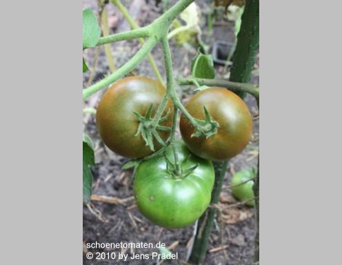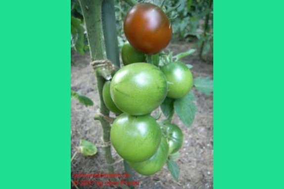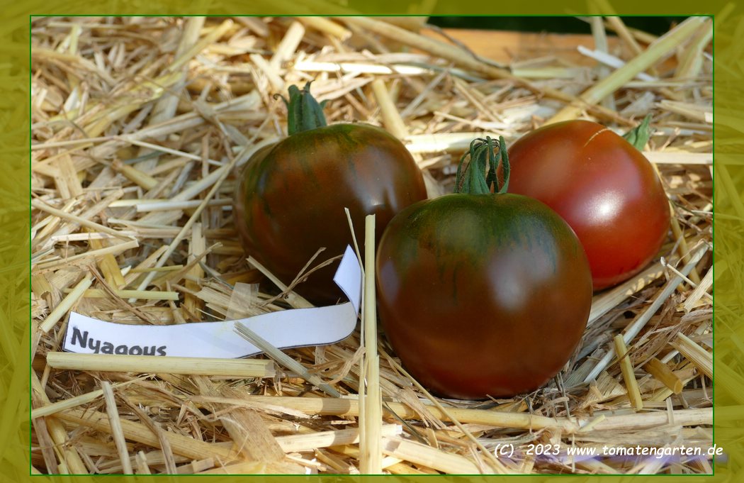 Nyagous - mittelgroße Pflanze (etwa 2 m), relativ schlank wachsend sehr früher Erntebeginn (Ende Juli) reich tragend mittelgroße (60 bis 100 g), runde, rostbraune, schwarzgrün geschulterte Früchte mit unterschiedlicher Fruchtkammerzahl sehr saftig und wohlschmeckend, zum Sofortverzehr, nicht ganz platzfest durchaus eine weiterzuempfehlende Sorte (Quelle: www.schoenetomaten.de)