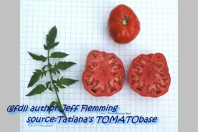 Neves Azorean Red - große Pflanze (bis 2 m) außerordentlich später Erntebeginn (Ende September) dadurch zum Ertrag keine Aussage möglich große, breitrunde, leicht und gleichmäßig gerippte, rote Früchte guter Geschmack, sehr saftig (Quelle: www.schoenetomaten.de)
