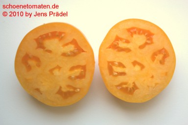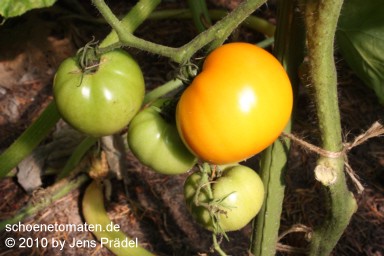 Orange Wonder - mittelgroße Pflanze (1,5 bis 2 m) mittelfrüher Erntebeginn (Mitte August) durchschnittlicher Ertrag große, leicht hochrunde, glatte, orangefarbene Früchte ausgezeichneter, lieblich-würziger Geschmack (Quelle: www.schoenetomaten.de)