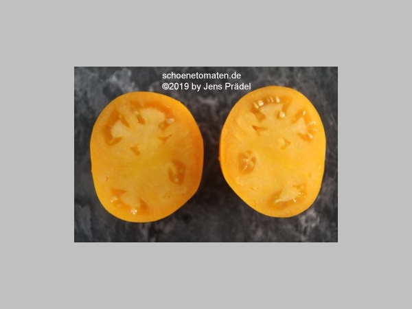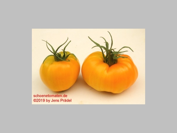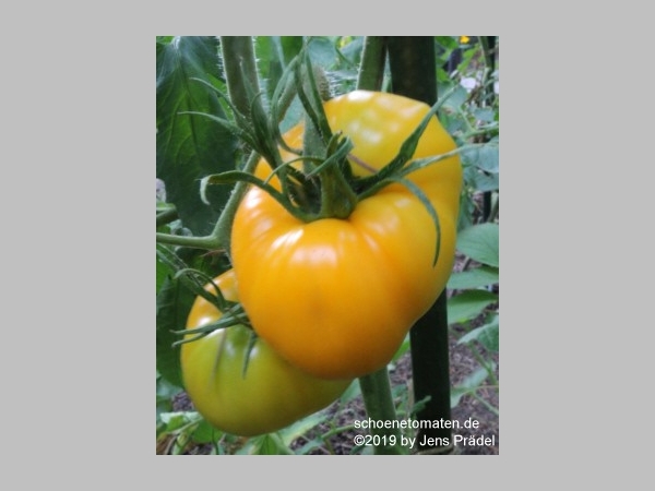 große (ø 6 bis 9 cm und 5,5 bis 8 cm hoch), überwiegend herzförmige, aber auch breitrunde,gelbe Früchte