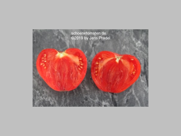 mittelgroße bis große (ø 5 bis 7 cm, ca. 7 bis 8 cm hoch), herzförmige oder unförmig beutelförmige, pinkrote Früchte