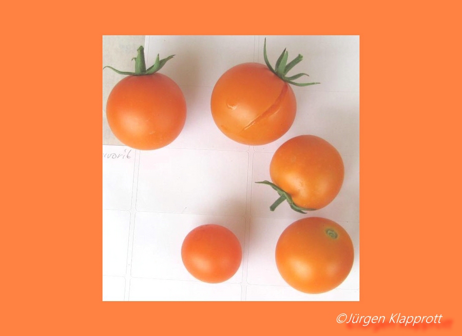 mittelgroße (ø ca. 5 cm), 50 bis 60 g schwere, runde bis leicht breitrunde, leuchtend orangefarbene Früchte