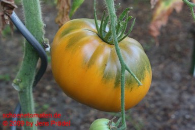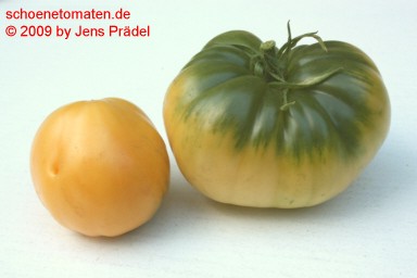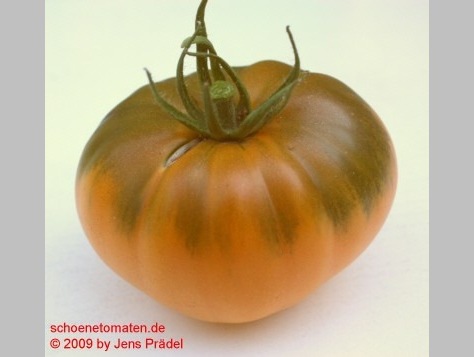 große (150 bis 240 g), breitrunde, leicht gerippte, orangefarbene, grünschultrige Früchte