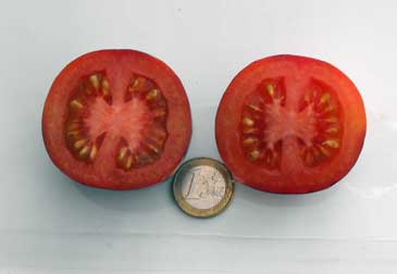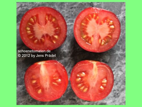 Aufgeschnitten sind die nahezu ausschließlich zweikammrigen Früchte durchweg rot gefärbt.