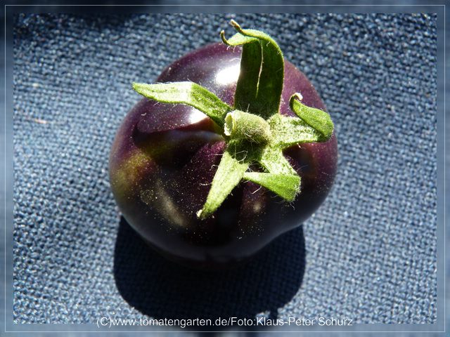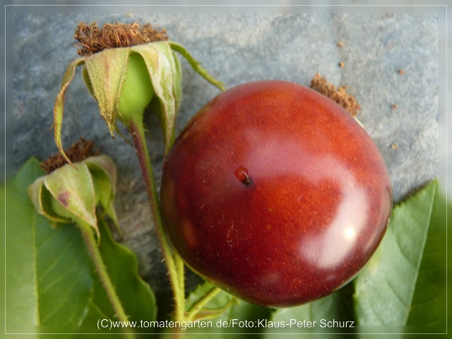 mittelgroße (ø ca. 4,5 cm und 40 bis 50 g schwer), runde, ungewöhnlich gefärbte Früchte mit kleiner, angedeuteter, stumpfer Spitze
