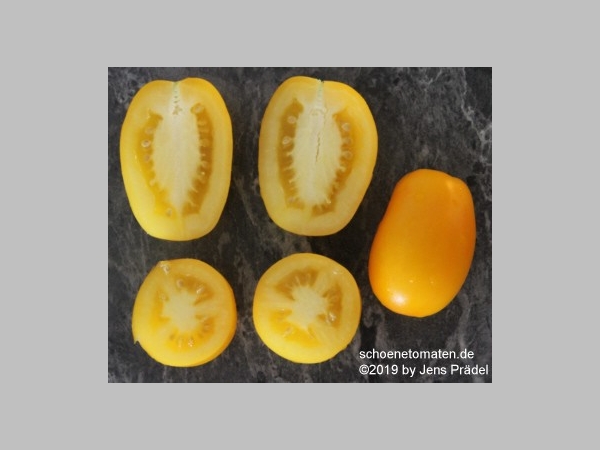 kleine (ø 3,8 bis 4,2 cm und 5,5 bis 6,5 cm hoch), 40 bis 50 g schwere, zapfenförmige, leuchtend gelbe Früchte