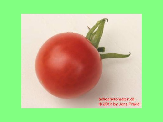 kleine (ø 2,5 bis 3 cm), etwa 10 bis 13 g schwere, runde, kräftig rote Früchte mit kleiner Spitze