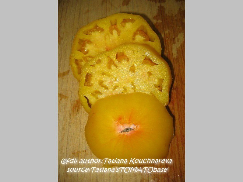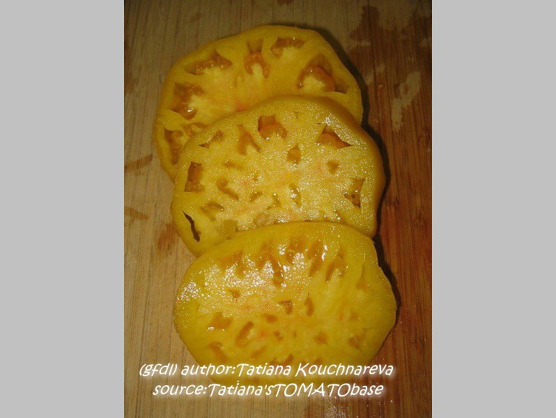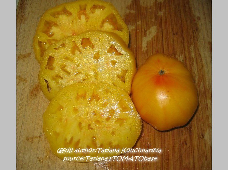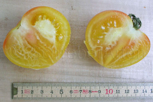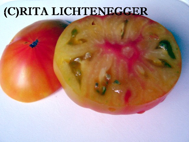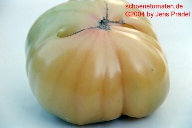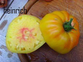 Habe die Sorte heuer, 2008, zum ersten Mal probiert. Samen von M.Hahm. Wenige, sehr große Früchte. spät reif. blaßgelb, im Innern roter Kern. sehr aromatisch.