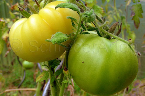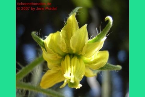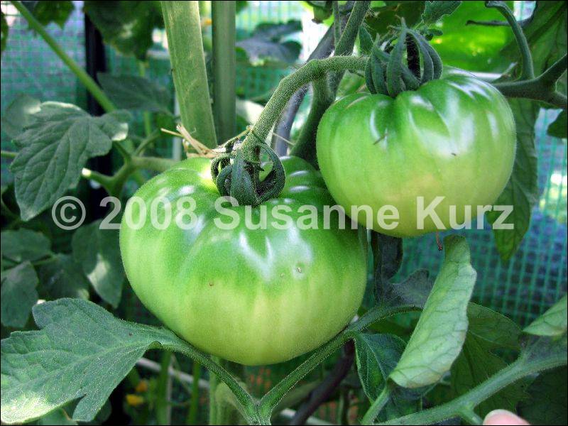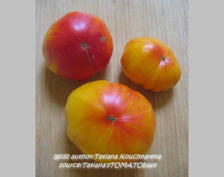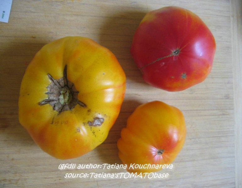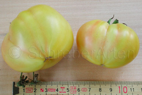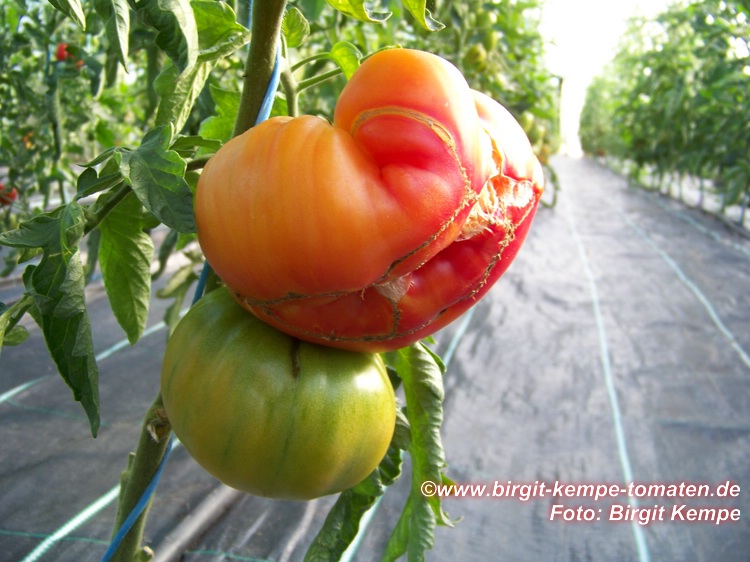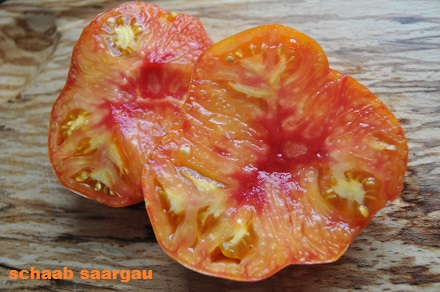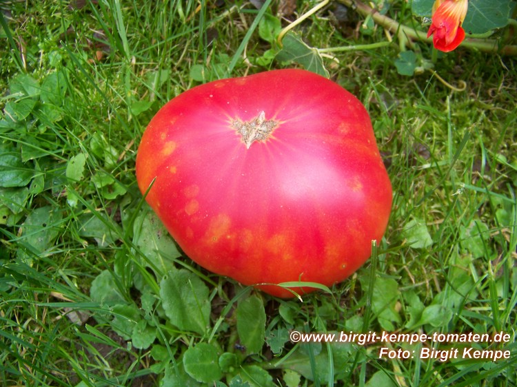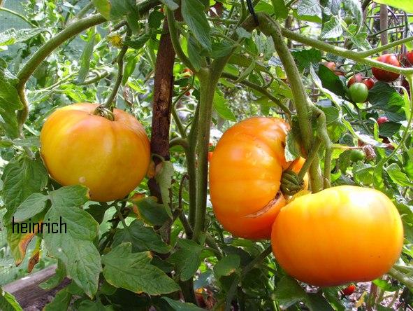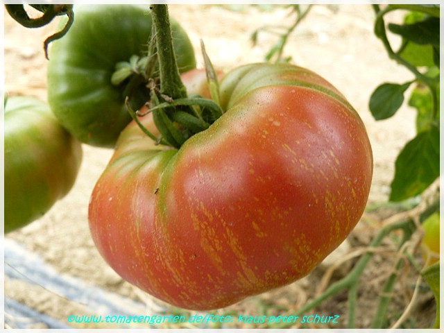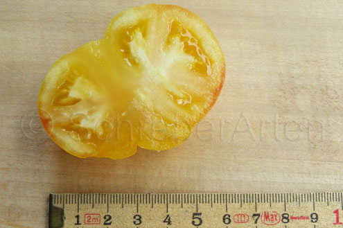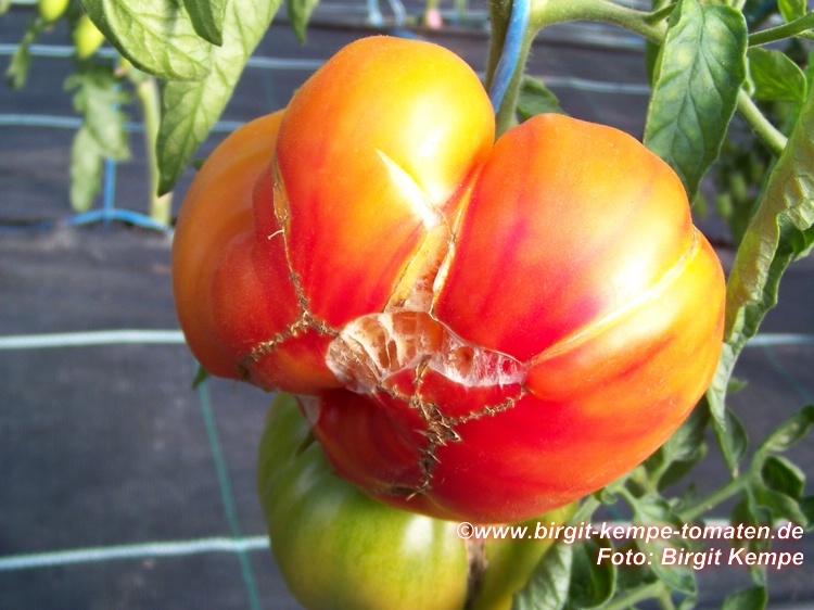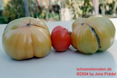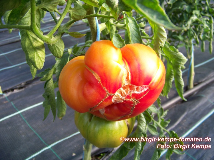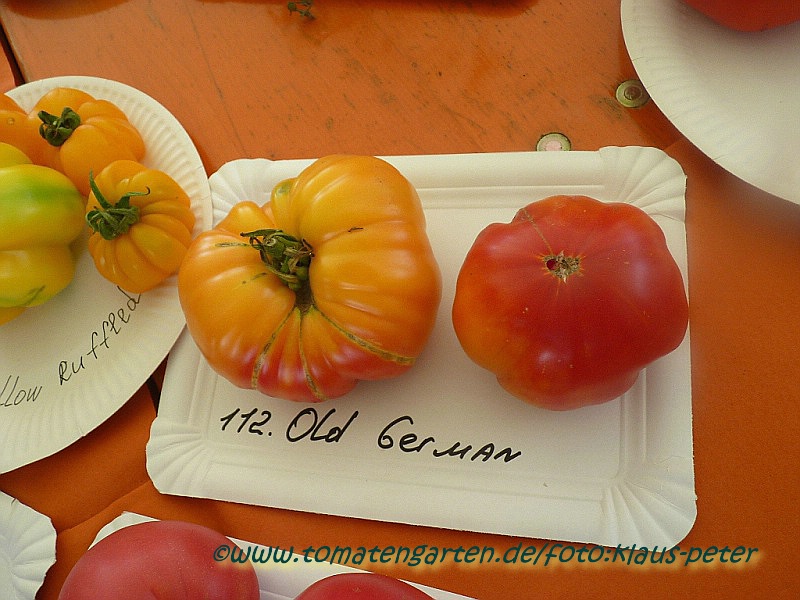 Old German - große Pflanze (2 bis 2,5 m) mittelfrüher bis später Erntebeginn (2. Augusthälfte) 2007 guter Ertrag sehr große, breitrunde, klobig wuchtige, gelborangene zum Fruchtboden hin rote Früchte Aufgeschnittene, vollreife Früchte ähneln Blutorangen. sehr saftig, angenehmer obstiger Geschmack schwerste geerntete Frucht (2004): 450 g schwerste geerntete Frucht (2007): 511 g Früchte sind etwas platzanfällig. Aufgeplatzte Stellen verheilen aber schnell. (Quelle: www.schoenetomaten.de)