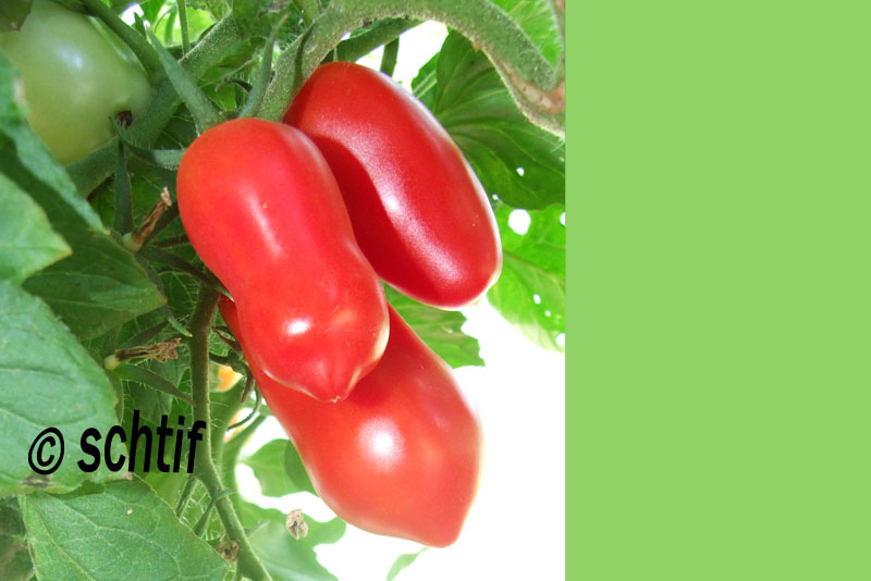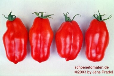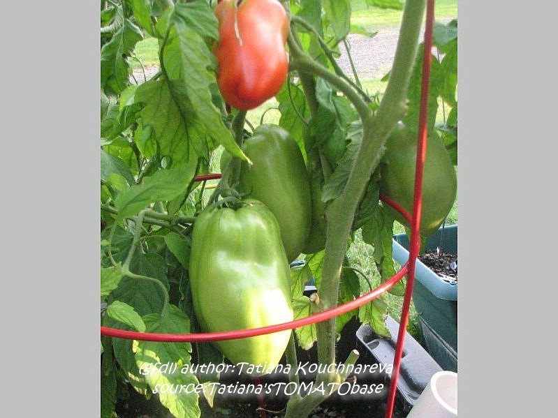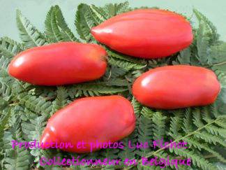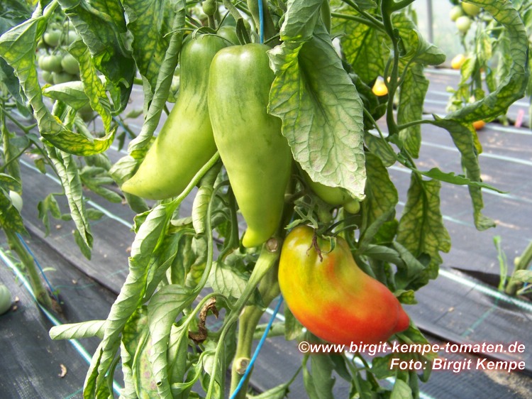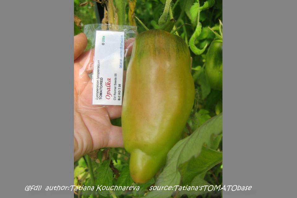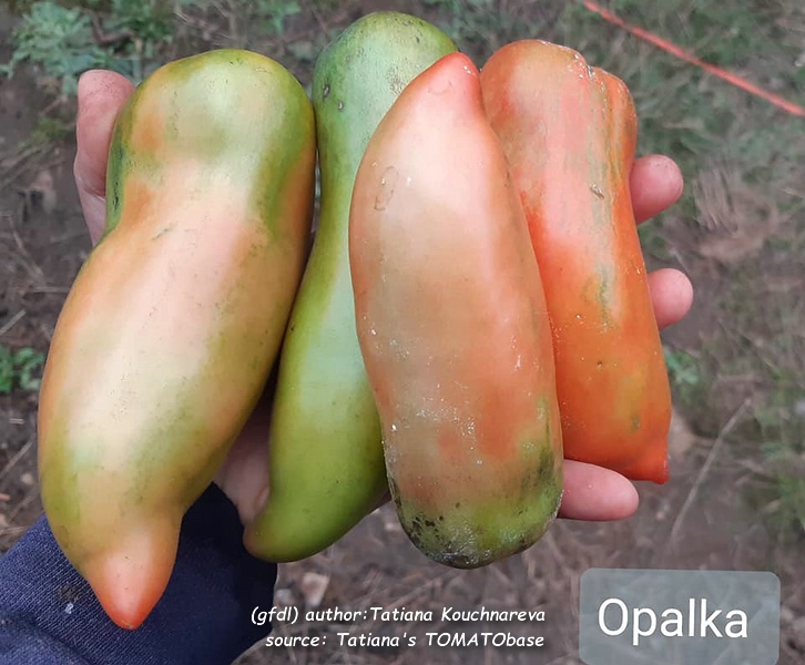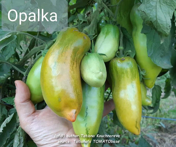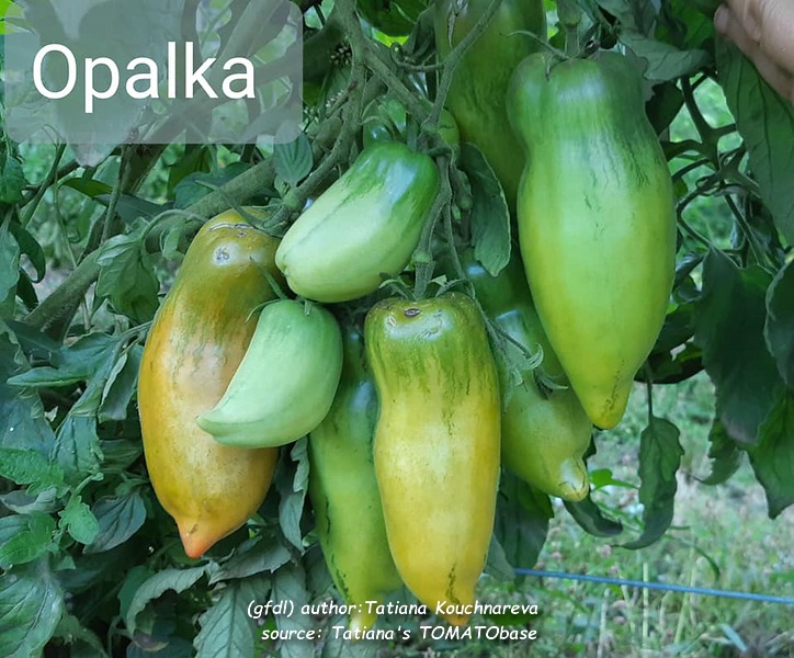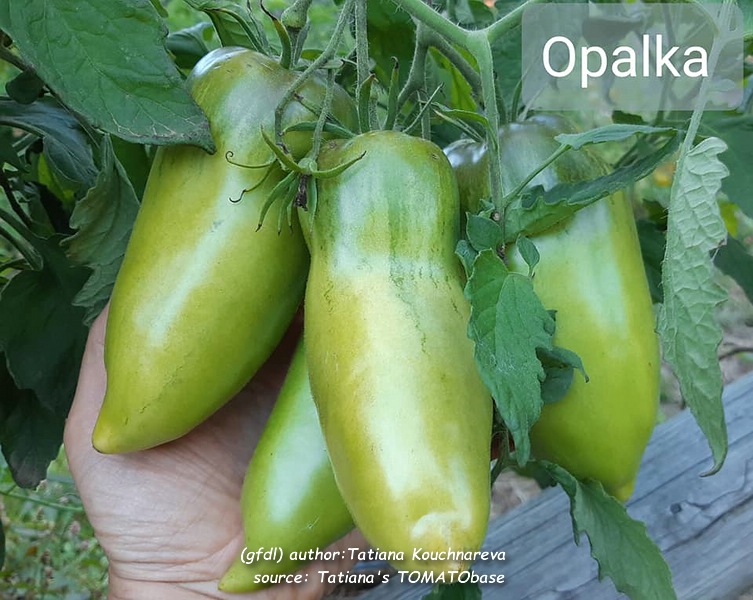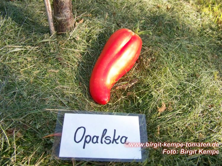 Opalka - sehr große Pflanze (2 bis 3 m) mittelfrüher Erntebeginn (Anfang bis Mitte August) hoher Ertrag länglich-ovale, rote, teilweise hohle Früchte nicht so saftig, aber "tomatig", ideal zum Schmoren (Quelle: www.schoenetomaten.de)