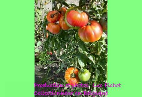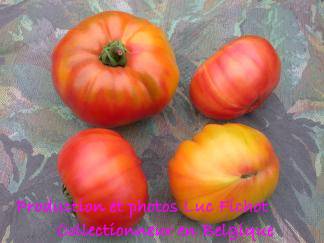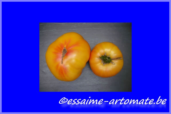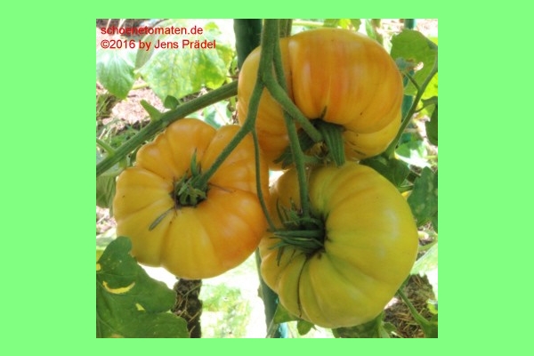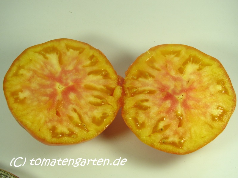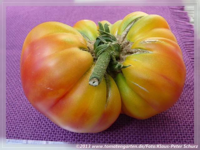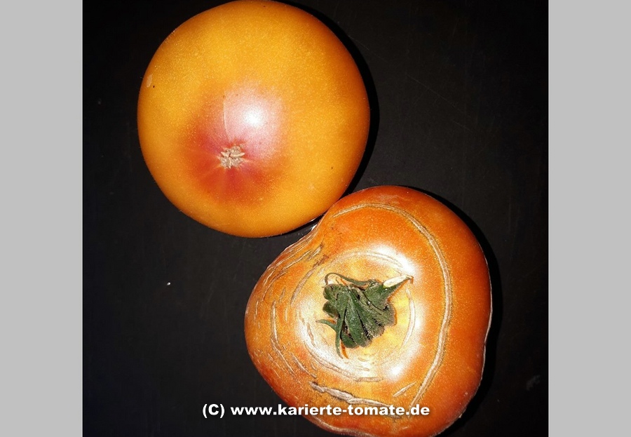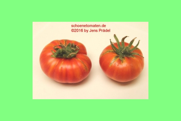 große (ø 9 bis 11 cm), breitrunde, leicht gerippte, orangerot gestreifte oder gefleckte Früchte