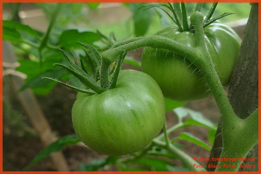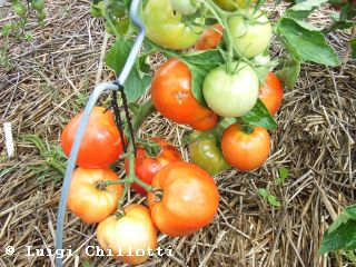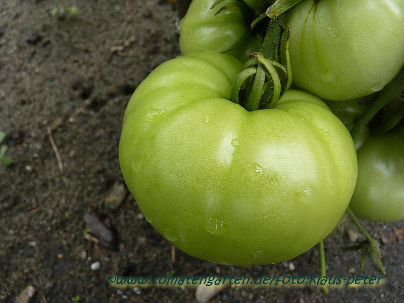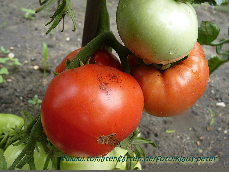 Pyros - große Pflanze (über 2 m) früher Erntebeginn (Anfang August) guter Ertrag sehr große (ø 10 cm keine Seltenheit), runde, leicht gerippte, rote Früchte Geschmack normal tomatentypisch lange tolerant gegen Braunfäule (Quelle: www.schoenetomaten.de)
