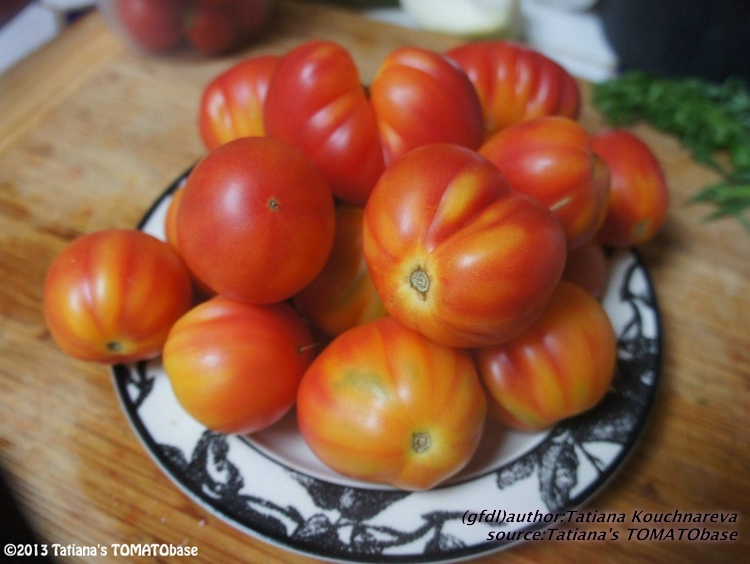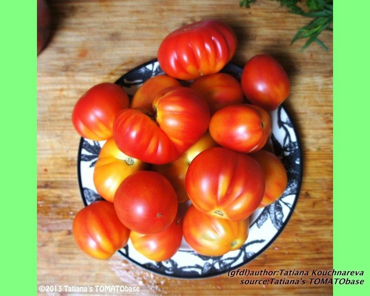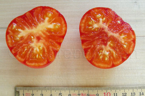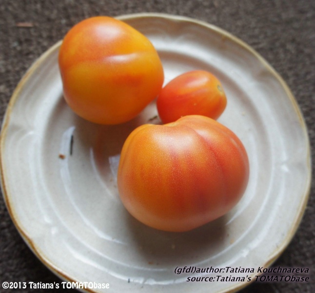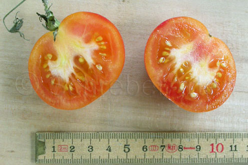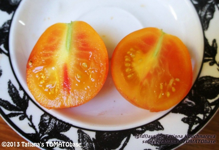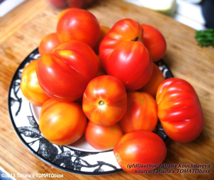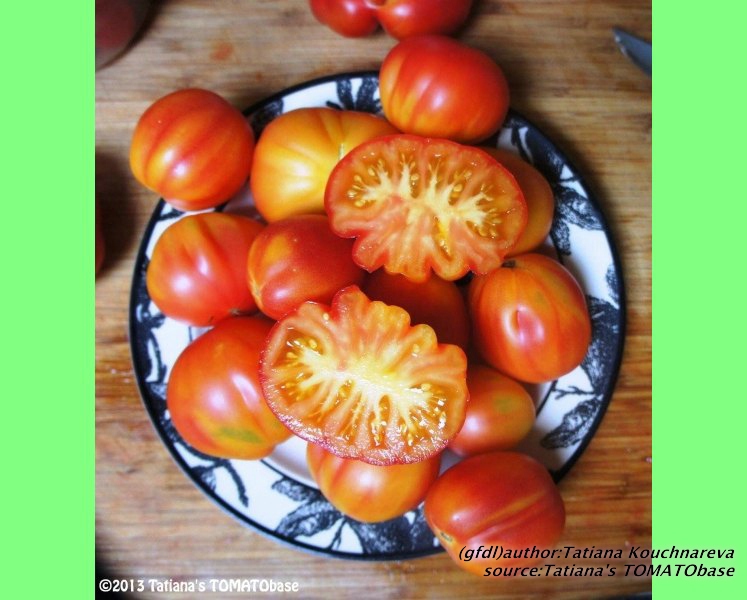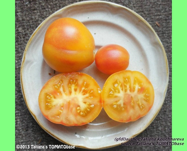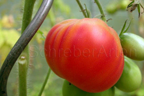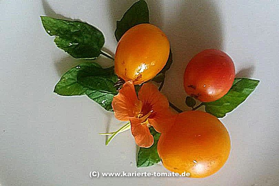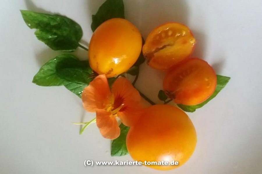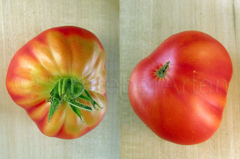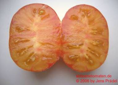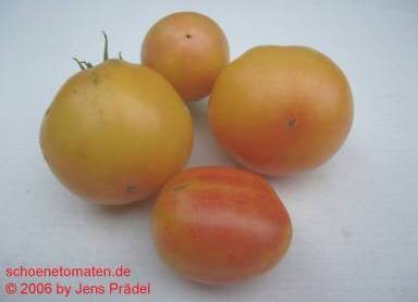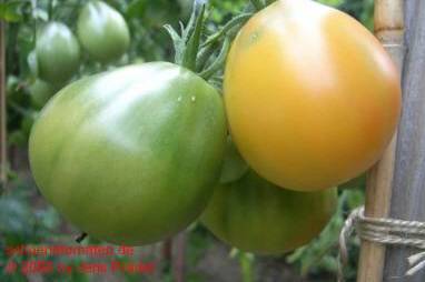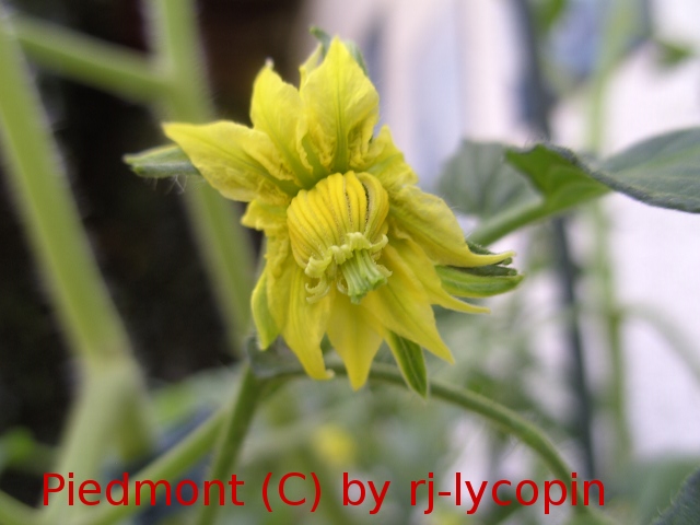 Piedmont - kleine Pflanze (bis 1,5 m) mittelfrüher Erntebeginn (Mitte August) begrenzter Ertrag mittelgroße (60 bis 150 g schwer), meist beutelförmige, aber durchaus auch unterschiedlich geformte, dunkelgelbe bis orangefarbene Früchte mit roten Flecken(meist am Fruchtboden) Fruchtfleisch von roter Maserung durchzogen fruchtig und saftig wie Obst (Quelle: www.schoenetomaten.de)