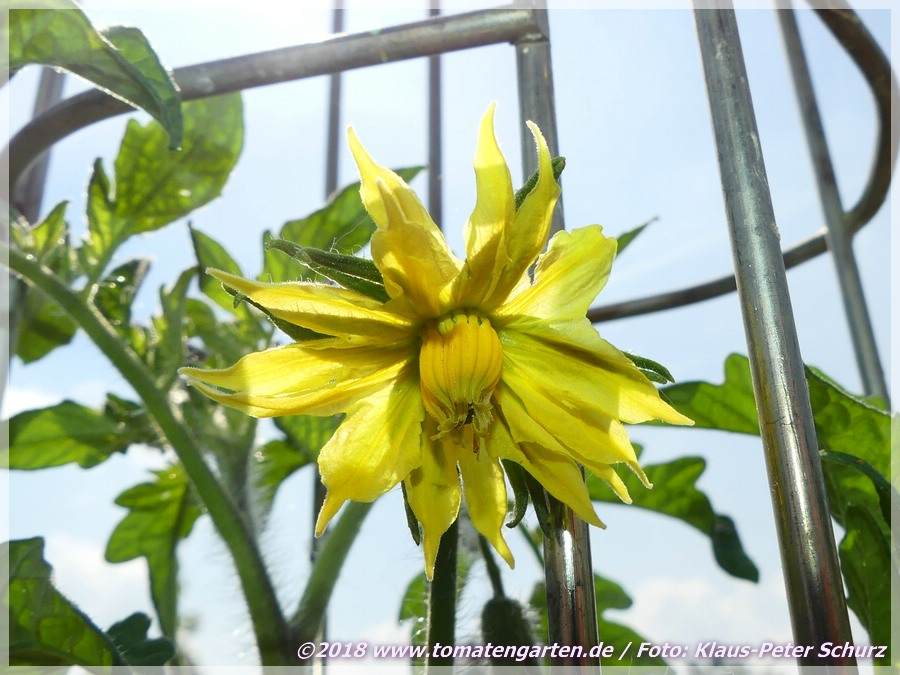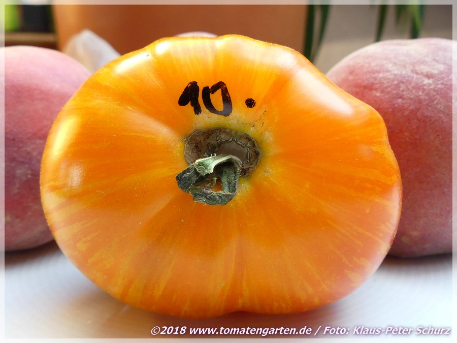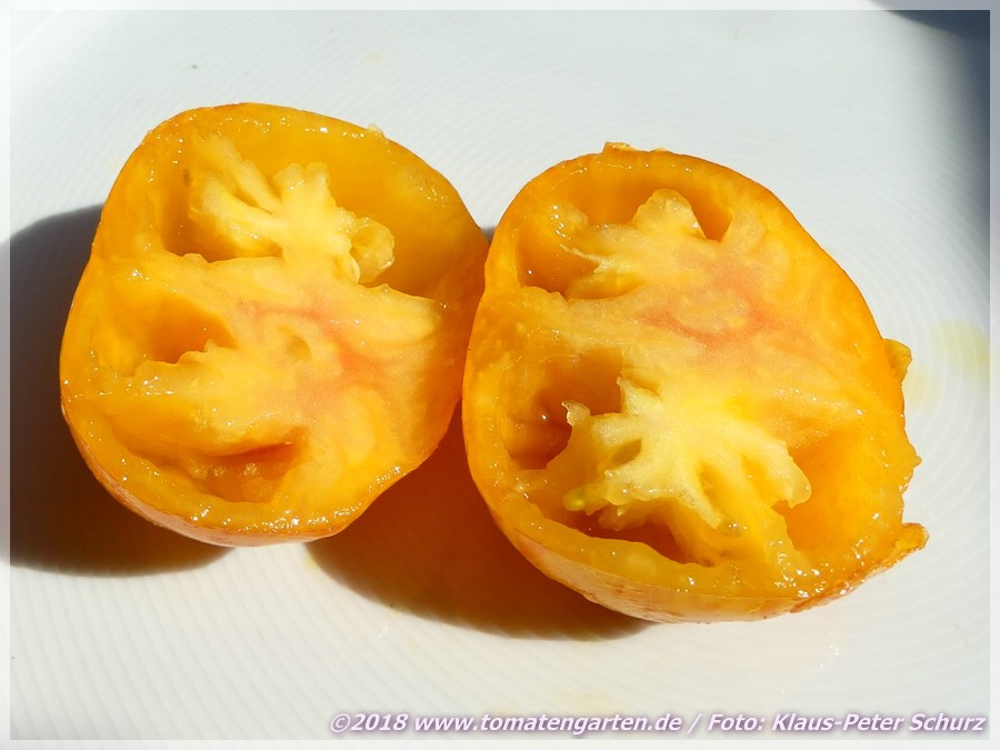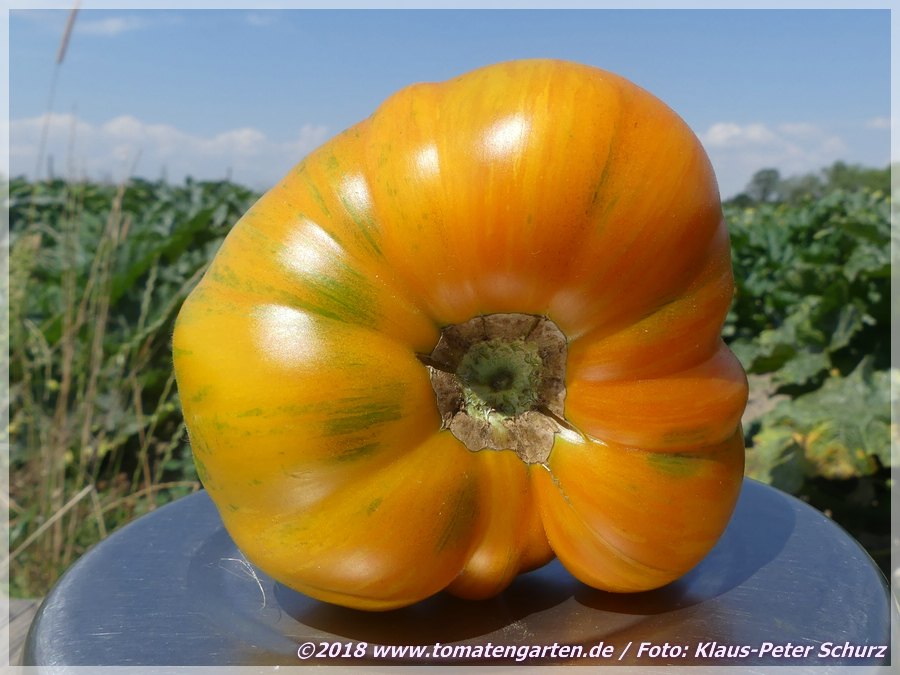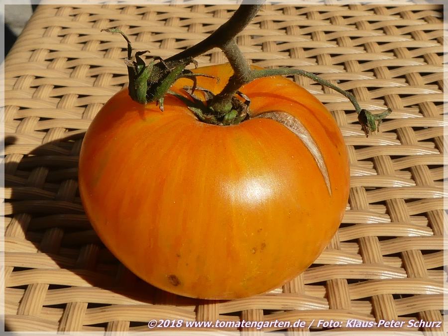 Sehr guter Ertrag, Geschmack sehr mild. Nicht ganz so intensiv, wie andere gelb-orange Sorten. Wenig Säure, fruchtig, nicht mehlig. Früchte so bis 250g, kann auch mal eine etwas größere dabei sein. Pflanzen werden so 1,80 bis 2m hoch und sind unempfindlich und gesund.