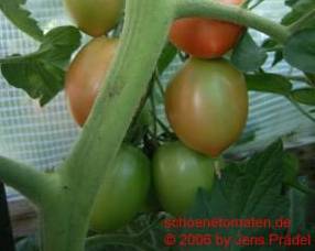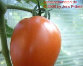 Poma - große Pflanze (über 2,5 m) früher Erntebeginn (Anfang August) sehr guter Ertrag, hervorragende Küchentomate mittelgroße, ovale (5 cm breit, 8 cm hoch) fast zitronenförmige, rote Früchte mit stumpfer Spitze Geschmack normal tomatentypisch Anfälligkeit für Braunfäule spät und gering (Quelle: www.schoenetomaten.de)