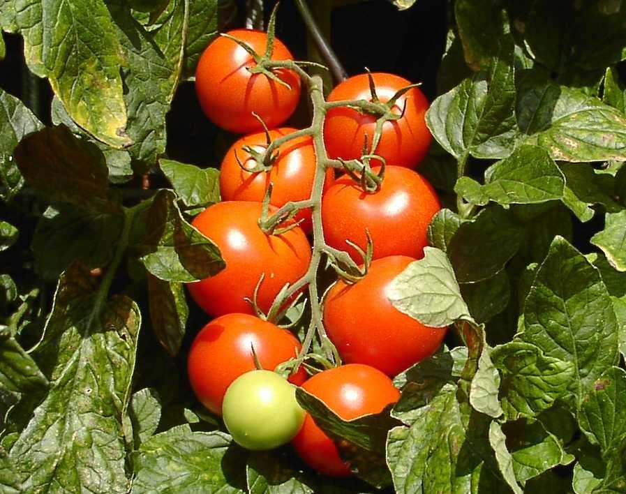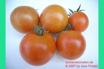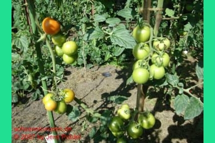 Rubor - extrem wüchsige Pflanze (zweitriebig über 3 m) sehr früher Erntebeginn (Ende Juli) außerordentlich ertragreich mittelgroße (ø 5 cm und 50 bis 80 g), runde, hellrote Früchte, orange besprenkelt normaler Tomatengeschmack, etwas feste Schale später Braunfäulebefall auch an einem ungünstigen Standort lange lagerfähig (Quelle: www.schoenetomaten.de)