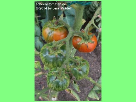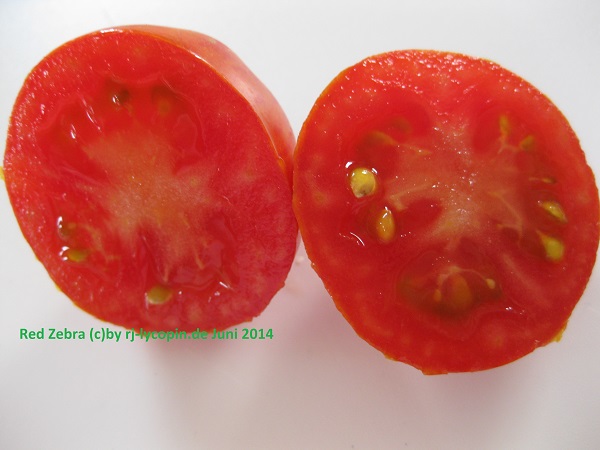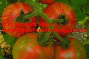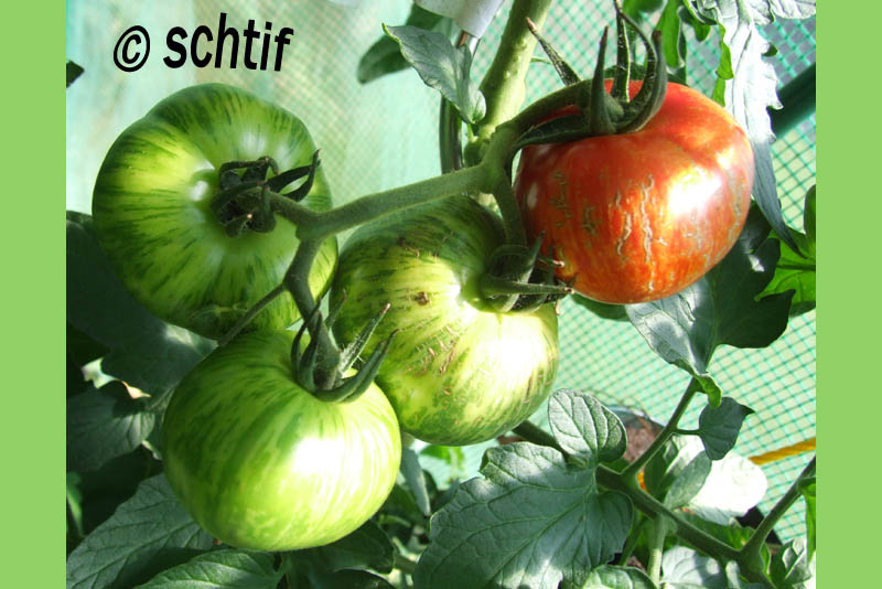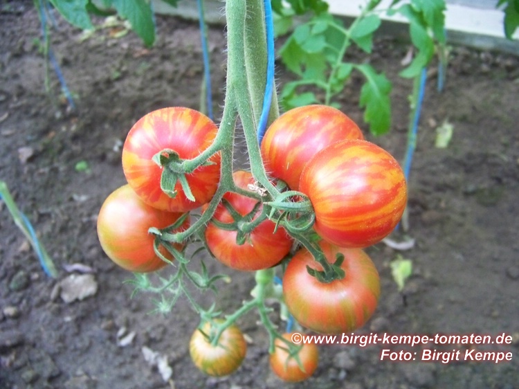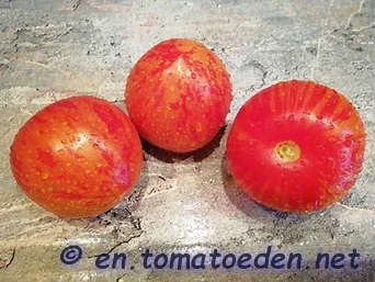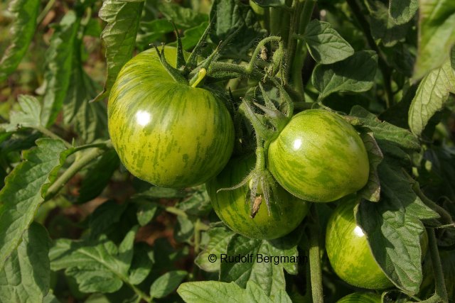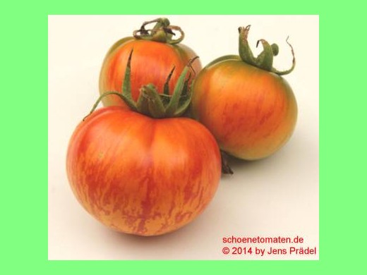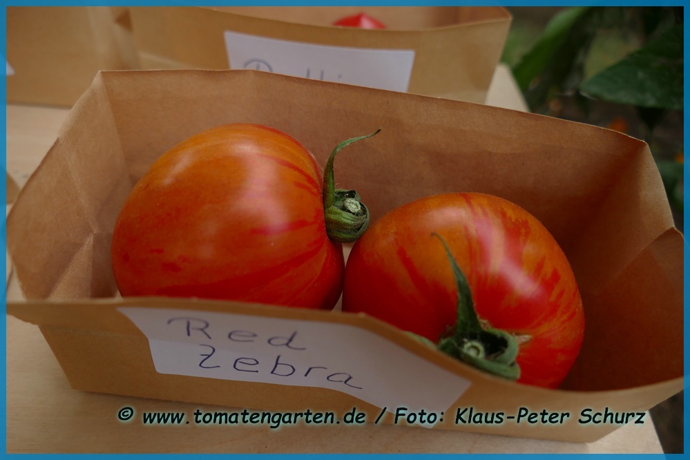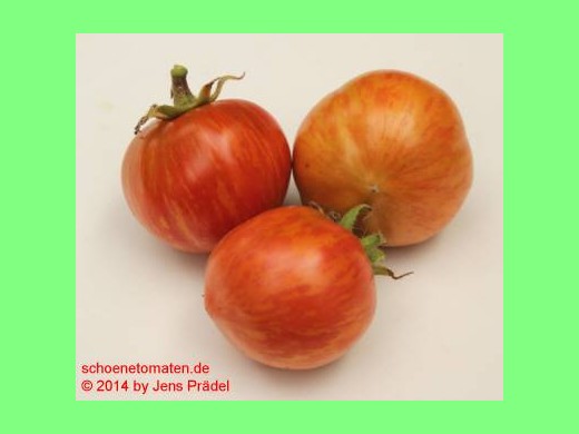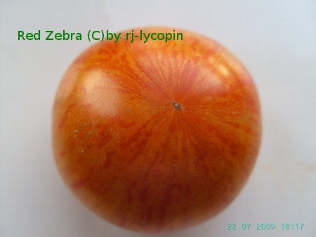Red Zebra - grosse (ca. 5-6 cm) runde rote Früchte mit gold gelben Streifen; hervorragender Geschmack (stark säuerlich); hoher Ertrag; Reife ab Anfang August. (Quelle: www.d-landsmann.de / Mit freundlicher Genehmigung des Autors)