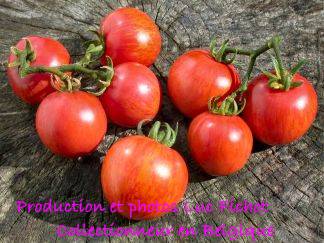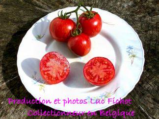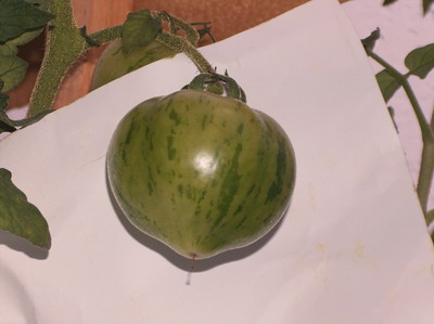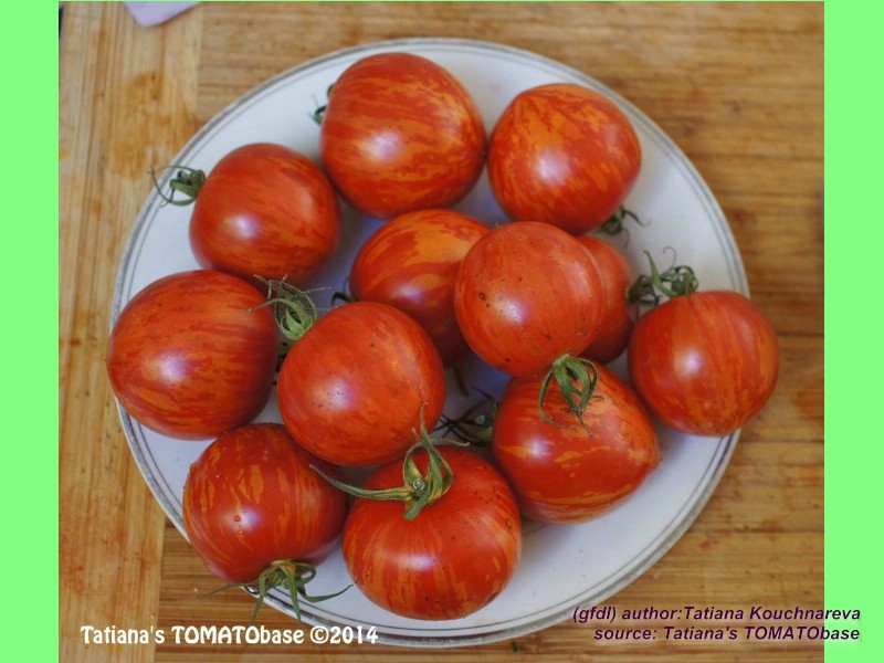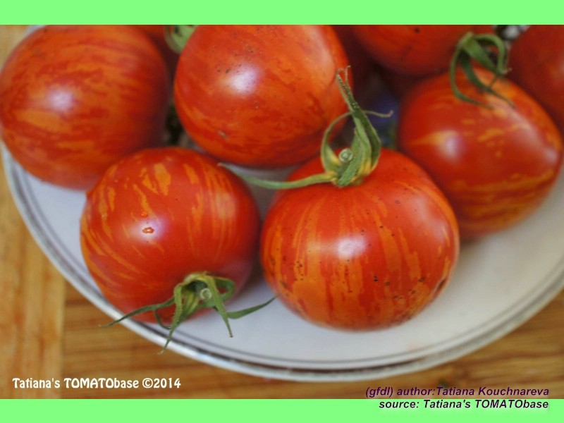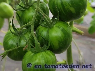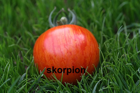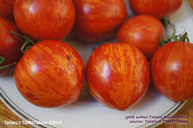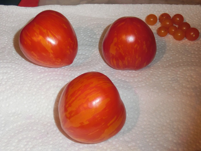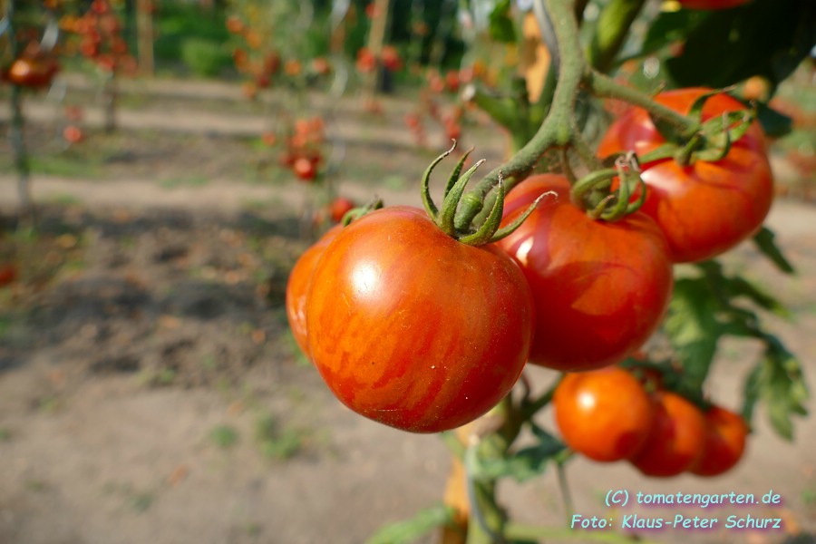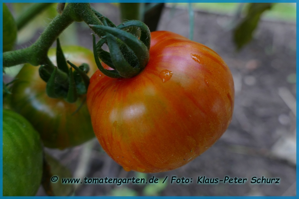 Red Zebra - grosse (ca. 5-6 cm) runde rote Früchte mit gold gelben Streifen; hervorragender Geschmack (stark säuerlich); hoher Ertrag; Reife ab Anfang August. (Quelle: www.d-landsmann.de / Mit freundlicher Genehmigung des Autors)