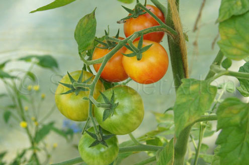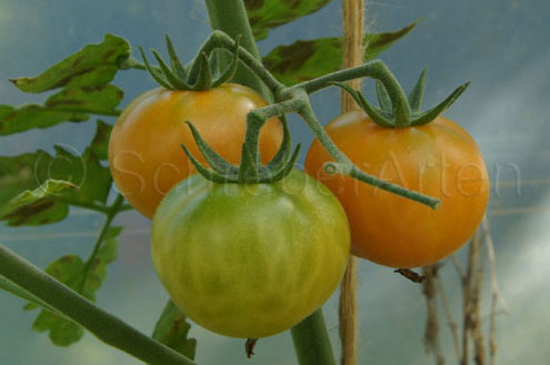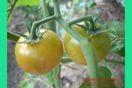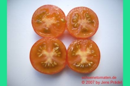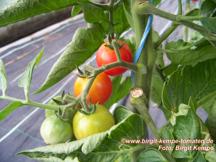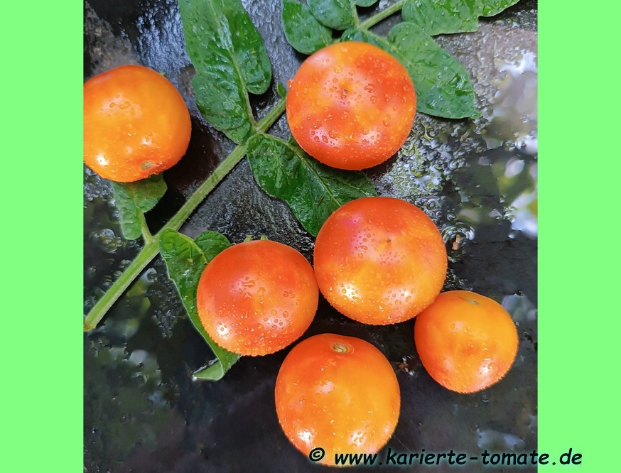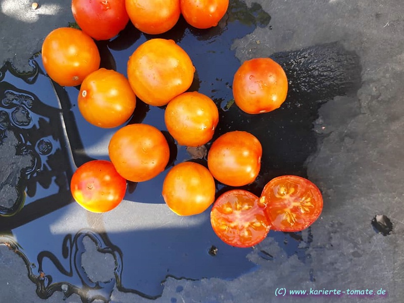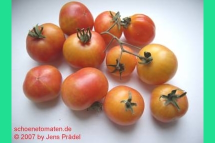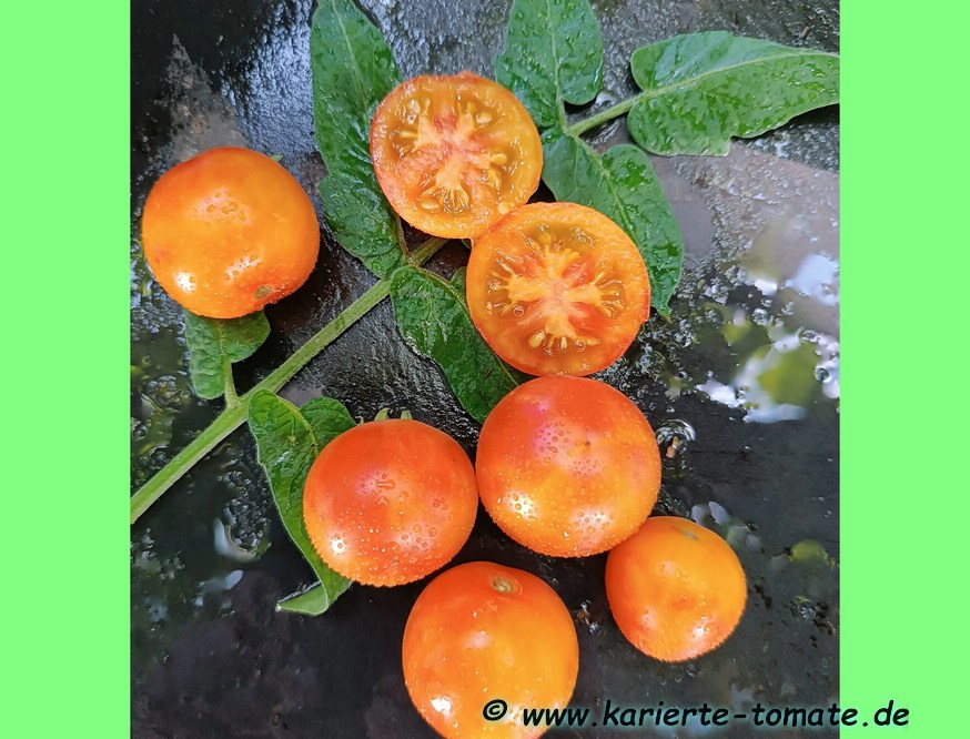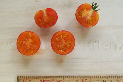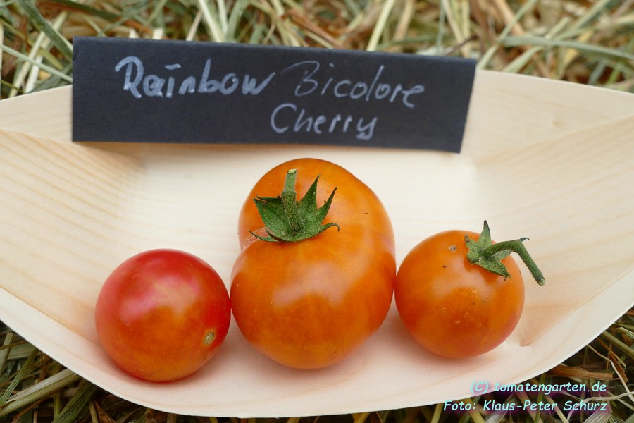 Rainbow Bicolor - große Pflanze (über 2 m) später Erntebeginn (Ende August) geringer Ertrag kleine (ø 3 cm und 15 bis 25 g), feste, runde (geringfügig breiter als hoch), orangerote Früchte mit gelben Flecken, aufgeschnitten durchgängig orange kräftiger Geschmack, saftig Früchte sind sehr lange lagerbar (bis Ende Januar), dann natürlich nicht mehr ganz so schmackhaft. sehr schöne Fruchtfarbe! (Quelle: www.schoenetomaten.de)