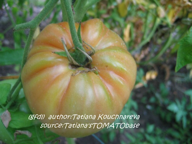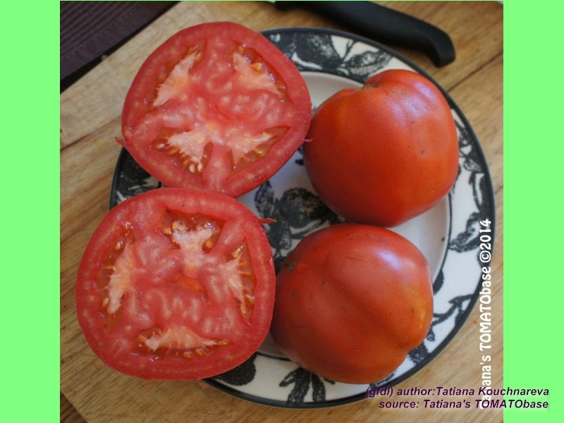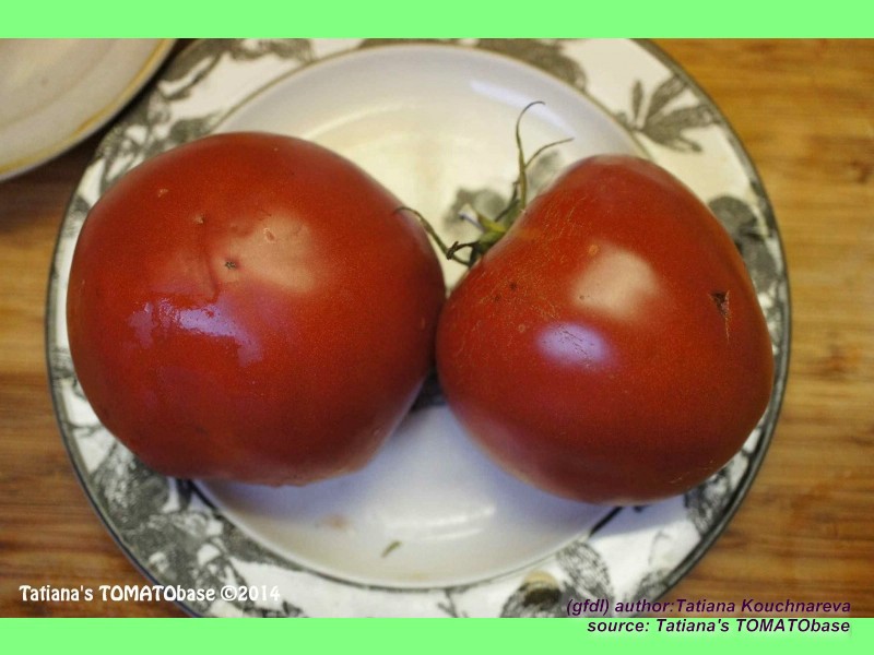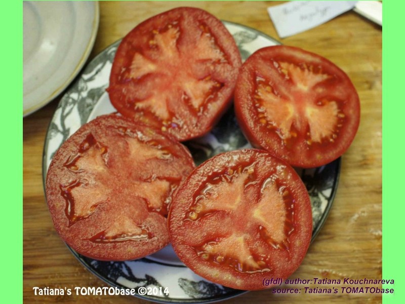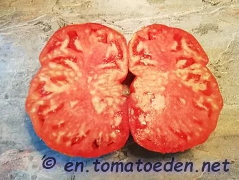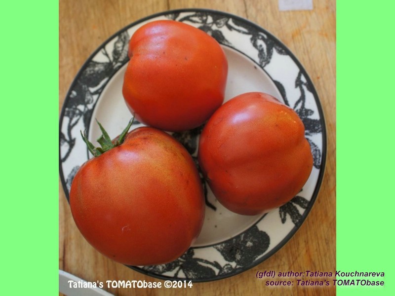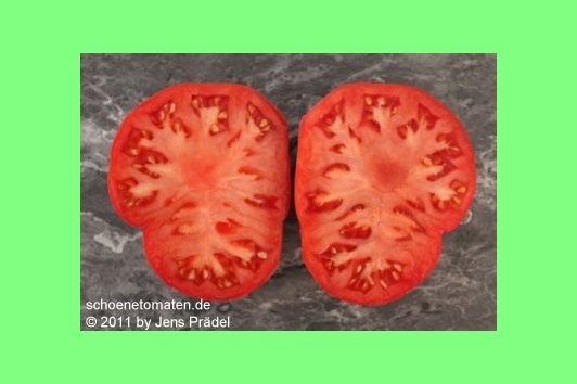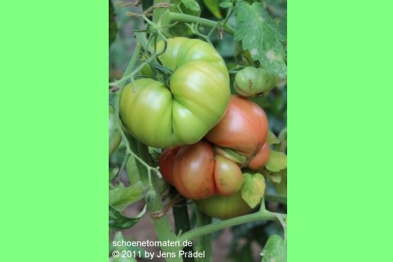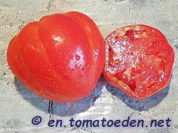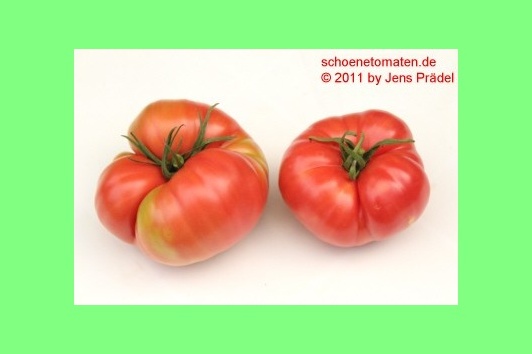 große bis sehr große (meist ø 9 cm), breitrunde, meist glatte, aber auch unregelmäßige, pinkrote Früchte