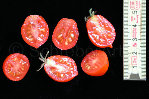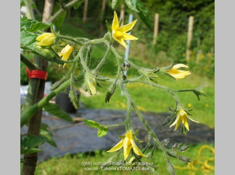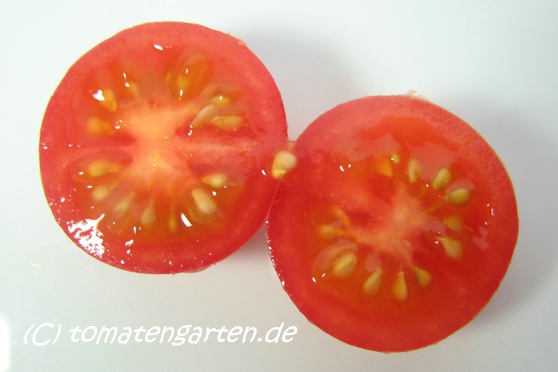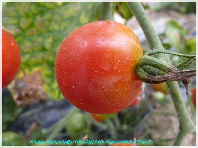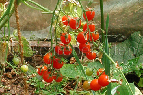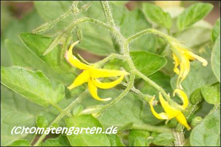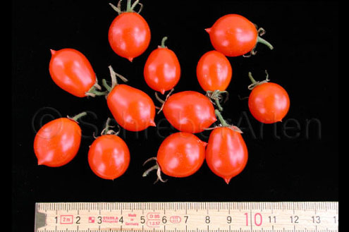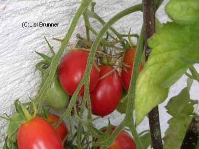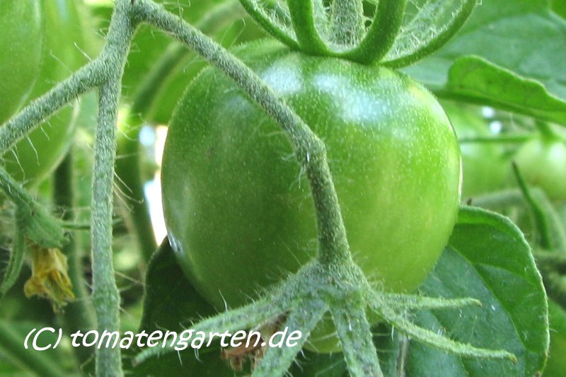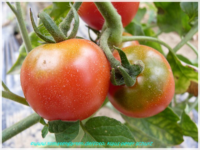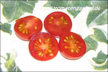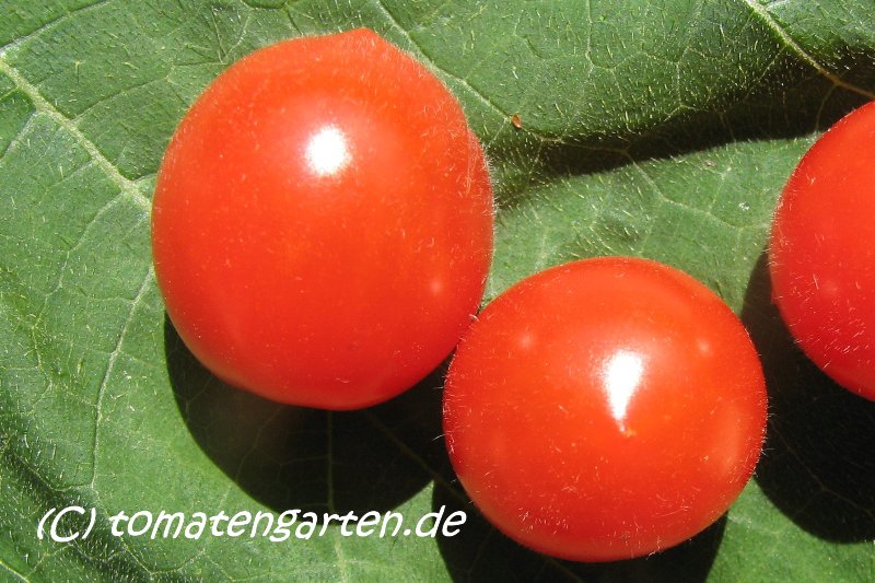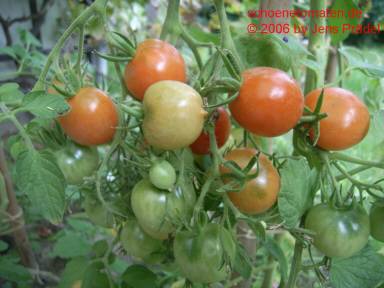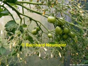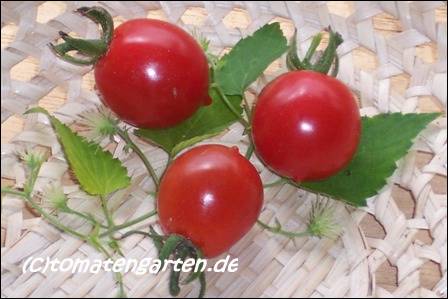 Riesentraube - kleine Pflanze (bis 1,5 m) später Erntebeginn (Ende August) mäßiger Ertrag kleine (ca. 20 g), runde, rote Früchte mit kleiner Spitze Die vielen Blüten in den wirklich riesigen und ungleichmäßigen Rispen (Trauben) verheißen einiges. Leider bilden sich bei weitem nicht so viele Früchte heraus. kräftiger Geschmack, nicht sehr süß, saftig (Quelle: www.schoenetomaten.de)