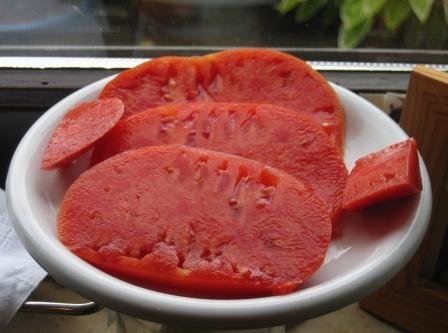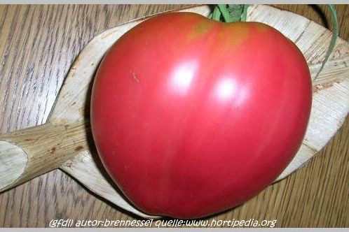 Sehr gute Tomate, fleischig, trotzdem saftig. Sehr große Früchte, 500-700 g.
