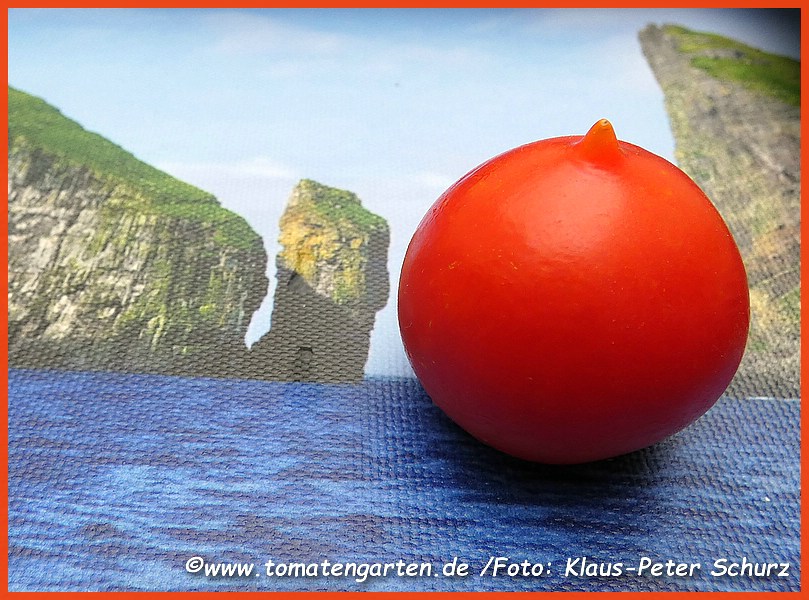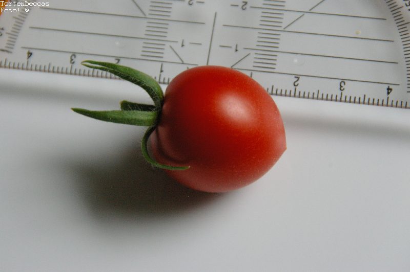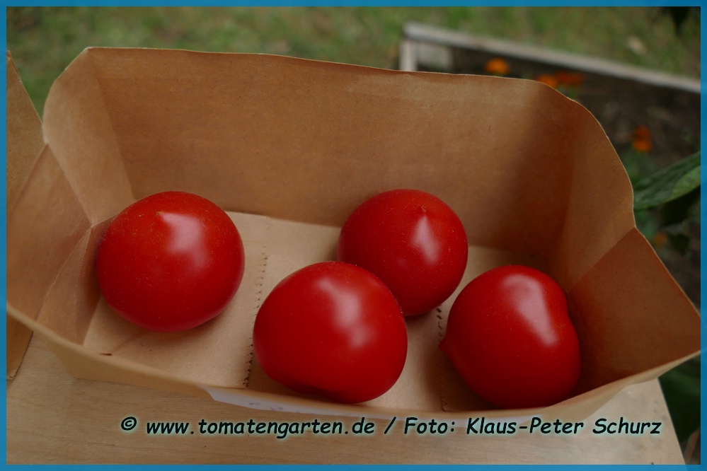 kleine (ø 3,5 bis 4 cm), 25 bis 35 g schwere, runde, rote Früchte mit deutlicher Spitze