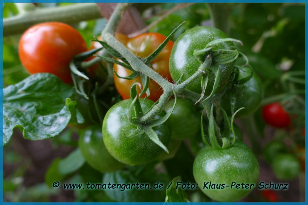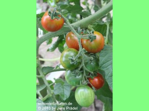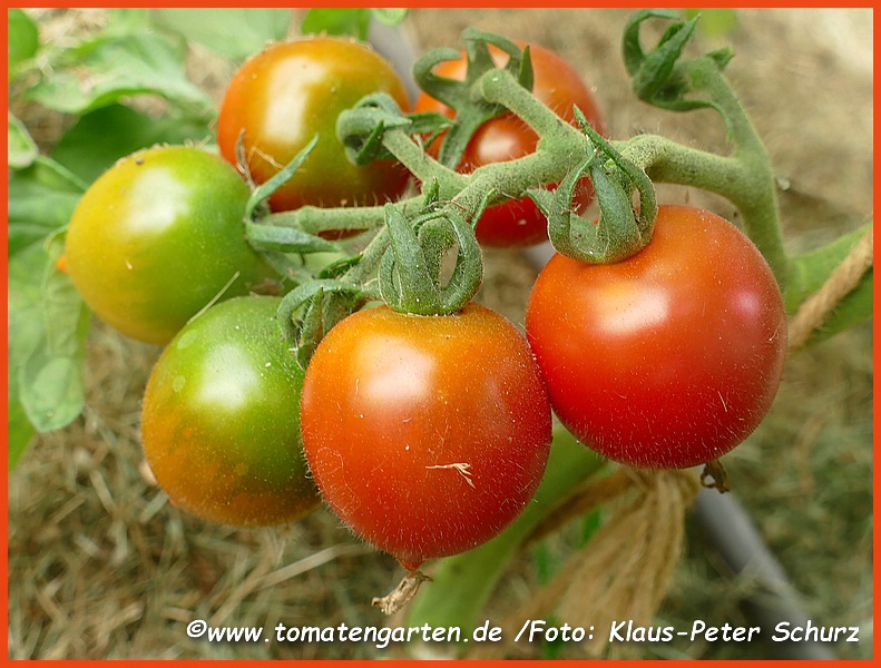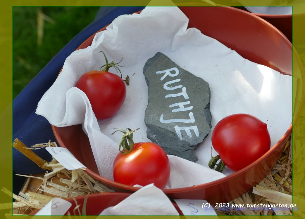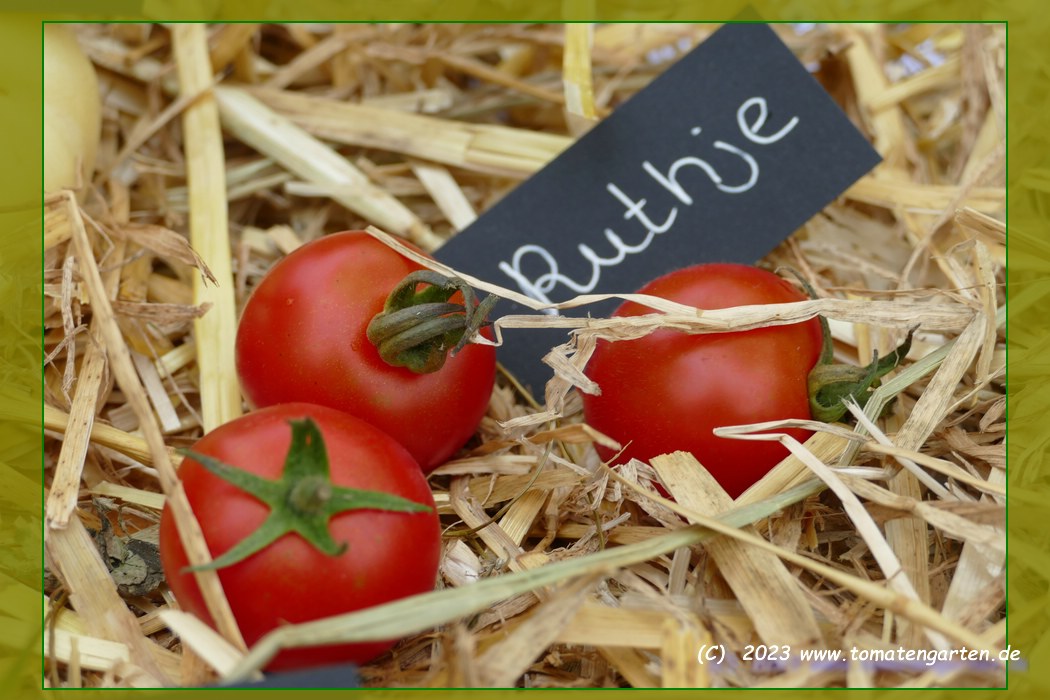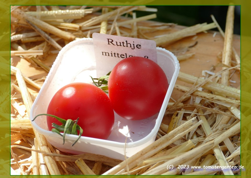 Ruthje ist die perfekte Tomate, um sie als komplette "Traube" nachreifen zu lassen - ist beim letzten Sturm ist mir Ruthje (im Kübel) umgestürzt und grasgrün, ohne jeden Hauch von rot, abgebrochen - nachdem ich sie als Dekoration im Haus platzierte, viel mir auf, dass sie sich sehr gut hielt und auch komplett ausreifte! Die Rispen liegen jetzt seit 7 wochen im wohnzimmer, sind essbar und nicht gefault!