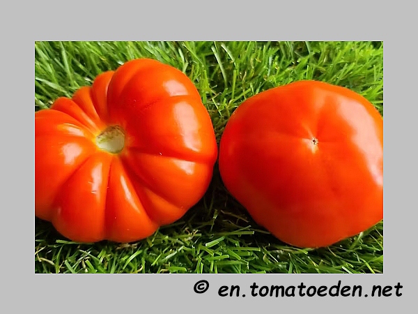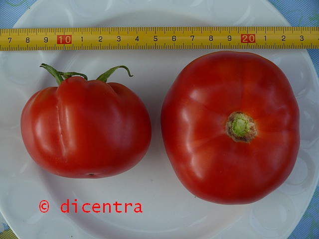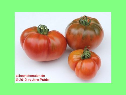 mittelgroße (ø 6 bis 9 cm), meist runde und ungerippte, aber auch unterschiedliche Formen (herzförmige und gerippte), rote Früchte mit grünlichem Kragen, der erst bei Vollreife verschwindet