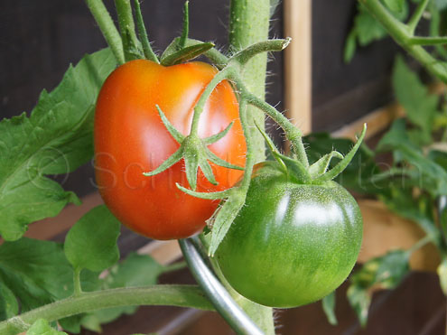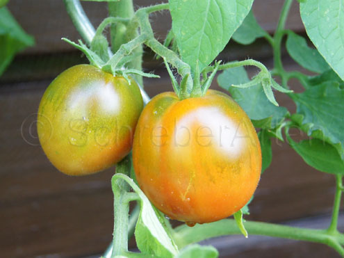 Angeblich reift die Tomate zuerst an der Spitze, der Rest der Frucht bleibt grün (daher der Name Red Target). Diese Art der Färbung war jedoch mit keiner Methode zu erzielen, auch dann nicht, wenn die Tomate grün geerntet wurde und mit der Spitze nach oben nachreifen konnte. Die Reifefärbung erfolgte stets gleichmässig über die gesamte Frucht, egal ob an den Pflanzen oder nachgereift. Der starke Grünkragen verschwindet. Den "Red Target Effekt" erreicht man vermutlich mit Fotobearbeitung.