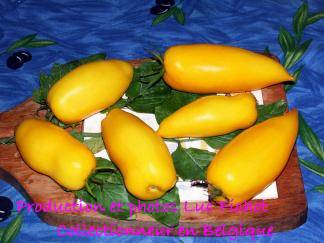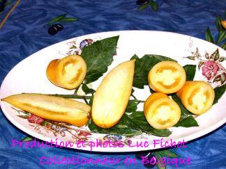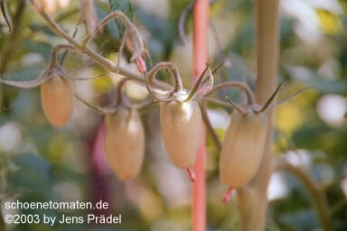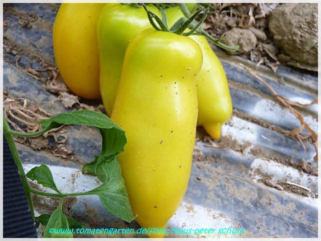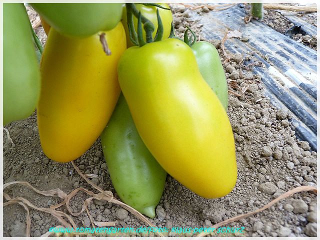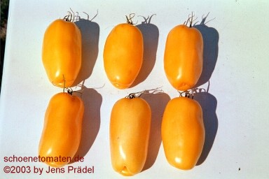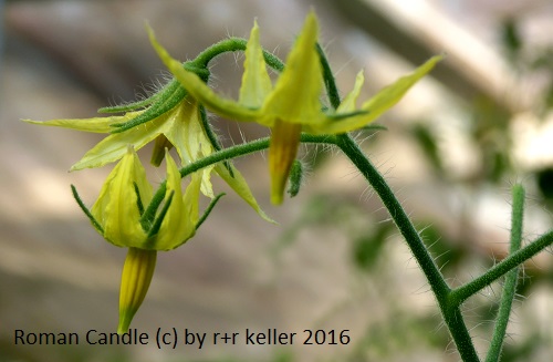 Roman Candle - sehr große Pflanze (bis 2,5 m) sehr später Erntebeginn (Mitte bis Ende August) guter Ertrag länglich-ovale, gelbe Früchte mit Spitze milder Geschmack, aber nicht sehr saftig (Quelle: www.schoenetomaten.de)