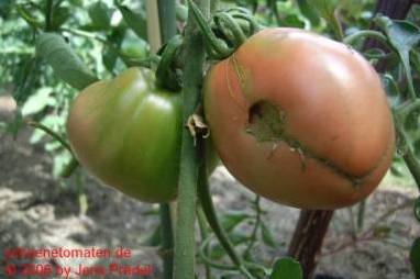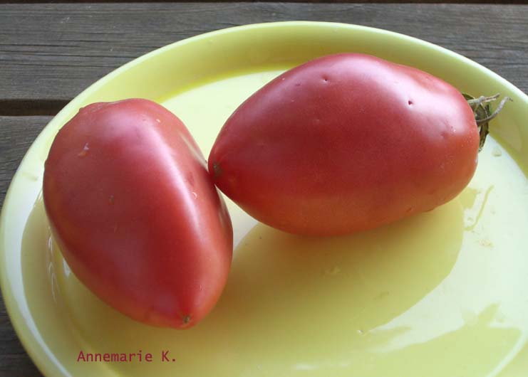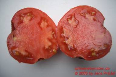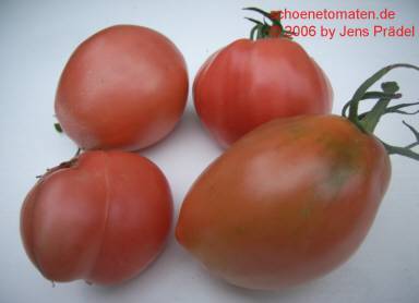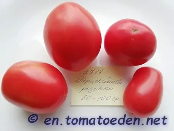 Rosovij Perzewidnij - sehr große Pflanze (2 bis 2,5 m) früher Erntebeginn (Anfang August) sehr ertragreich mittelgroße bis sehr große, länglich bauchige, pinkrote Früchte mit stumpfer Spitze größte geerntete Frucht: 337 g ausgezeichneter, süßer Geschmack, saftig und fleischig eine sehr zu empfehlende Sorte! (Quelle: www.schoenetomaten.de)