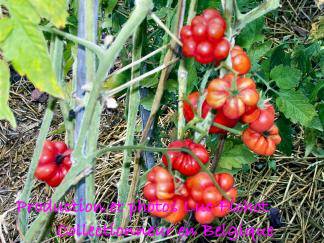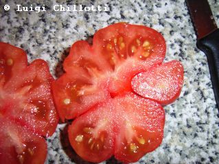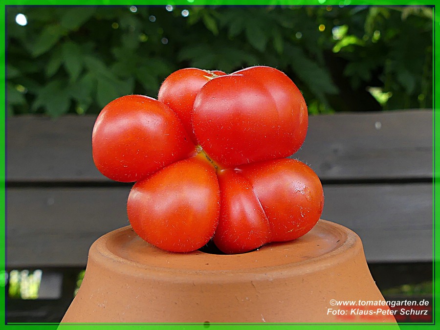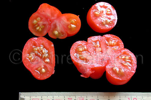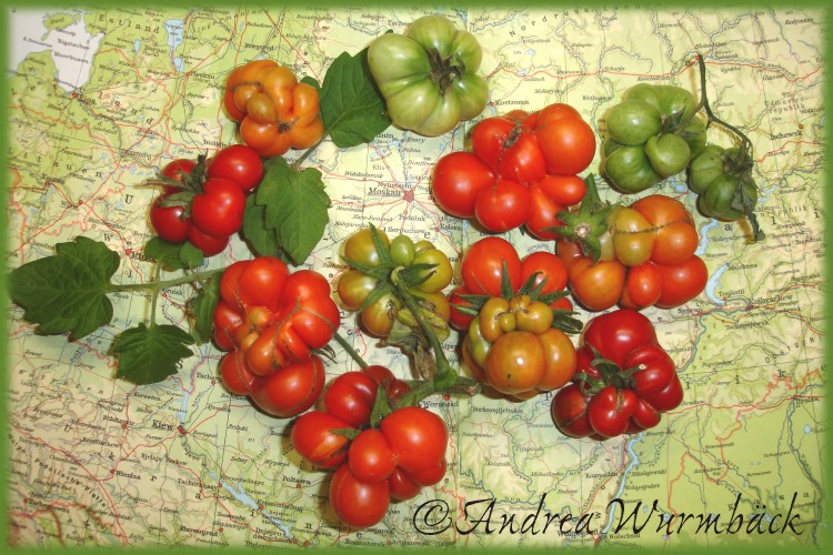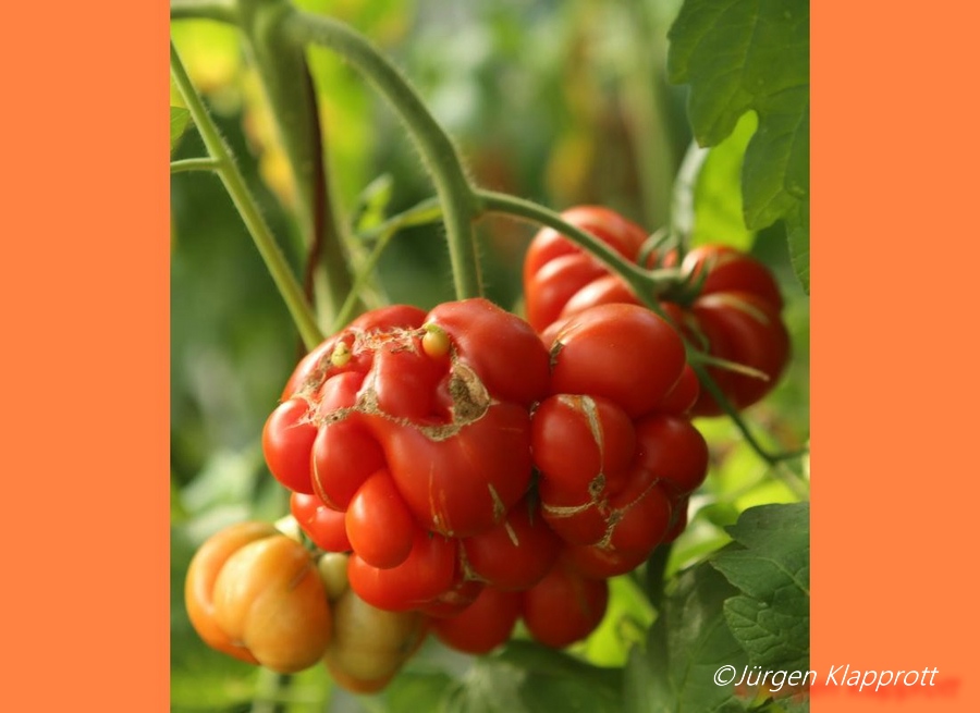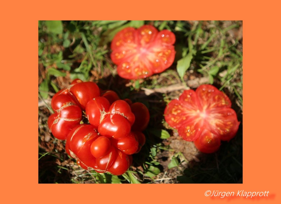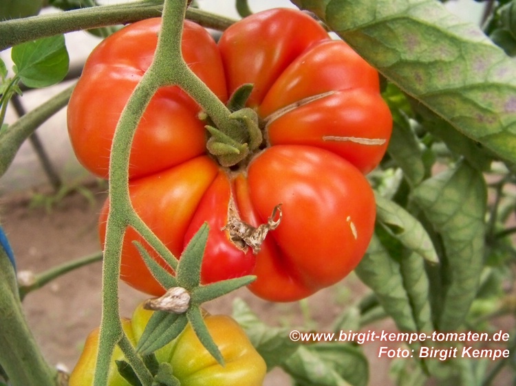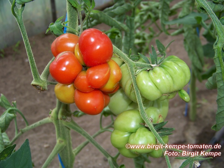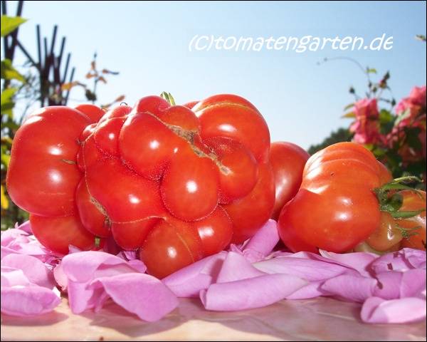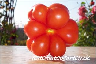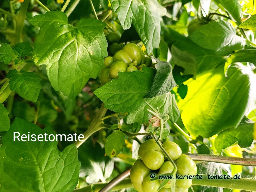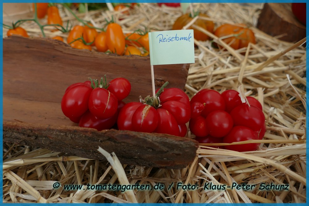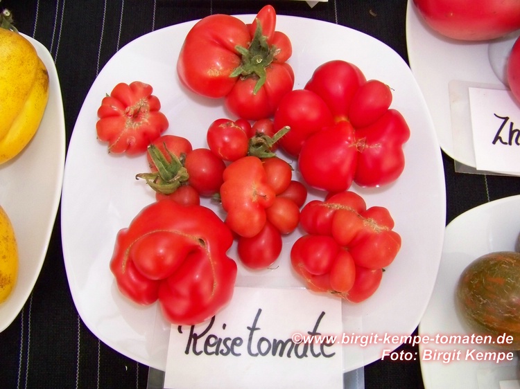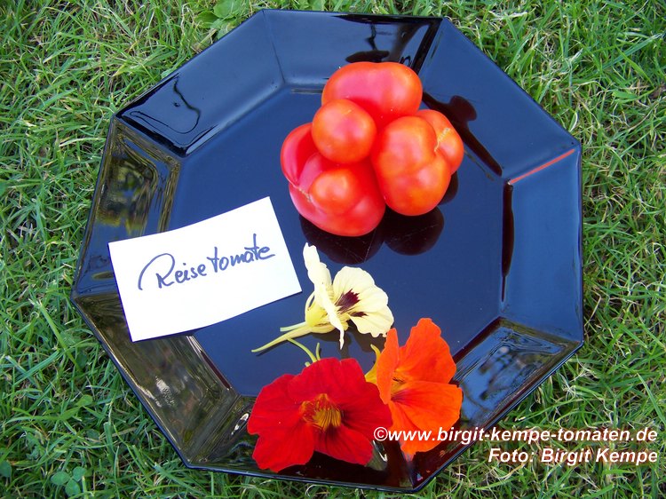 Reisetomate - sehr große Pflanze (dreitriebig über 3 m), extrem wüchsig und viele Geiztriebe früher Erntebeginn (Anfang August) 2003 eher durchschnittlicher Ertrag, 2007 dagegen ein gewaltig hoher Ertrag (2 Pflanzen mit zusammen 12 kg) mittelgroße, rote, gekerbte, oft stark gerippte Früchte, die sich zu teilen beginnen Dadurch entstehen viele ungewöhnliche Formen. durchaus guter säuerlicher Geschmack, sehr saftig extrem lange lagerbar (Die vor dem Frost grün geernteten Früchte hielten bis Ende Januar!) eine Sorte, die man unbedingt einmal probieren sollte! (Quelle: www.schoenetomaten.de)