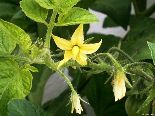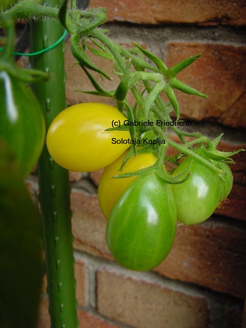 Ich hatte die Solotaja Kaplja in diesem Jahr das erste Mal; sie wird einen Stammplatz in meinem Garten erhalten. Sie ist wüchsig, robust (keine Braunfäule) und trägt sehr reichlich. Doch das beste ist ihr Geschmack: Sie ist eine ausgesprochene "Naschfrucht". Sie ist fruchtig, etwas süß, saftig, hat keine harte Schale und ist trotzdem nicht sehr platzanfällig. Ich habe sie mehrtriebig gezogen; erst ab dem 3. Achseltrieb habe ich ausgegeizt. Das macht zwar etwas mehr Arbeit, denn bei der Länge der Triebe muss regelmäßig an hohe Stäbe festgebunden werden. Doch der Aufwand lohnt sich. Ich habe eine große Menge sehr schmackhafter Tomaten geerntet. Auch jetzt habe ich direkt am Haus noch eine Pflanze stehen, die noch volles grünes Laub hat und noch viele Früchte angesetzt hat. Aus Zeitgründen habe ich die anderen Pflanzen noch grün abgeerntet. Die Tomaten reifen im Haus nach. Das funktioniert einwandfrei; selbst die kleinsten Früchte werden noch gelb.