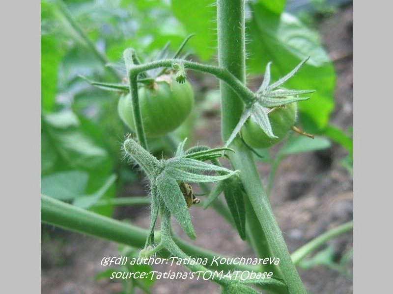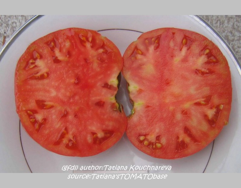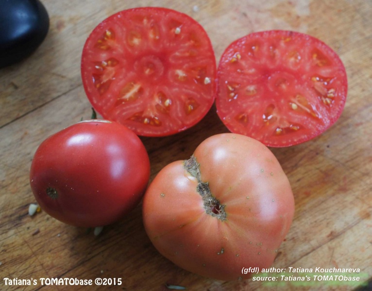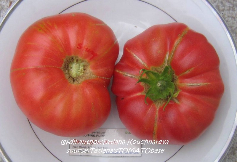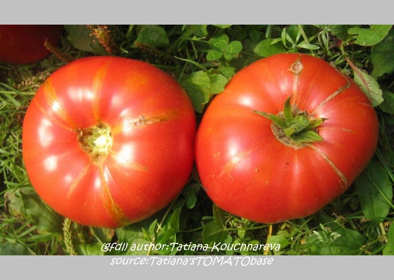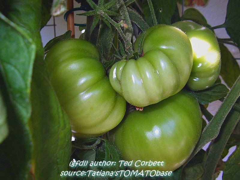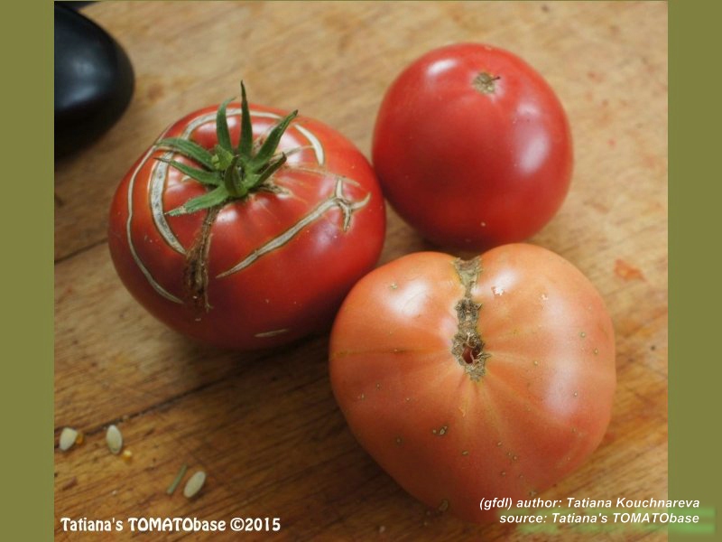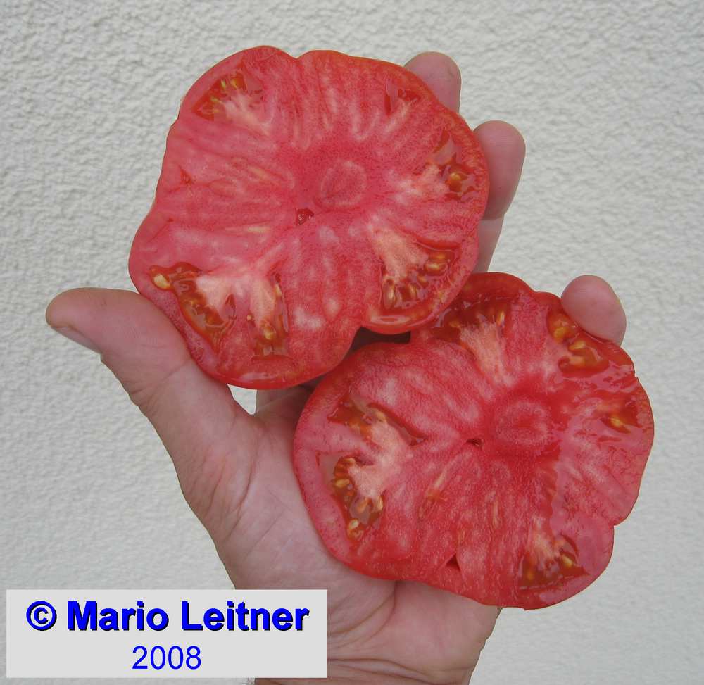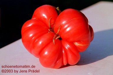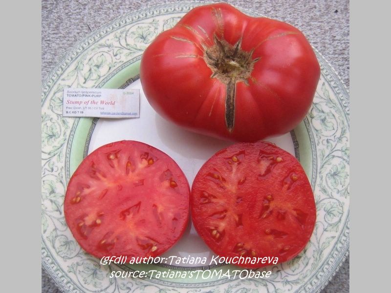 Stump of the World - große, kartoffelblättrige Pflanze (bis 2 m) mittelfrüher Erntebeginn (Anfang bis Mitte August) guter Ertrag teilweise sehr große, unregelmäßig gerippte, rote Früchte guter Geschmack, sehr saftig schwerste geerntete Frucht: 412 g (Quelle: www.schoenetomaten.de)