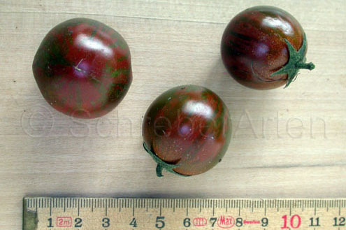 große (ø 6 bis 7 cm), 90 bis 110 g schwere, runde, glattschalige, ungewöhnlich schwarzgrün-rot gefärbte Früchte