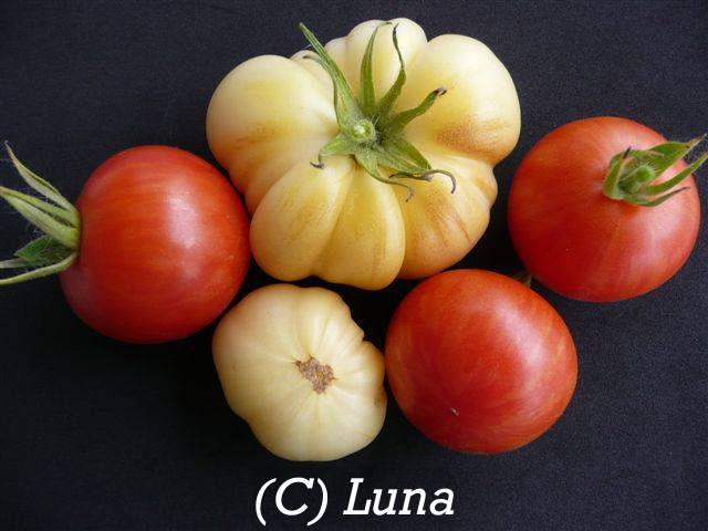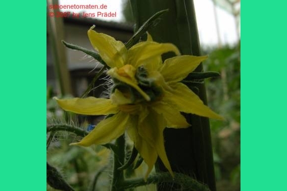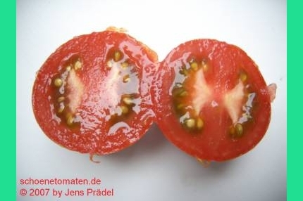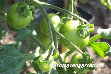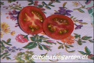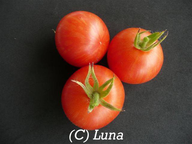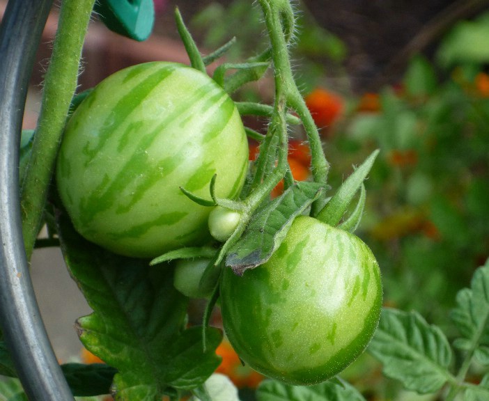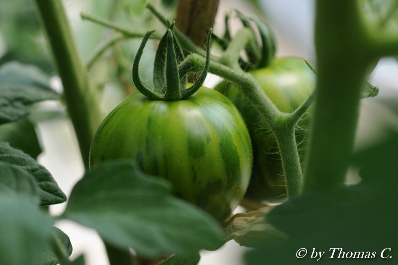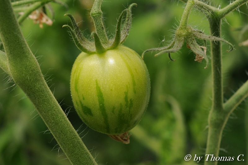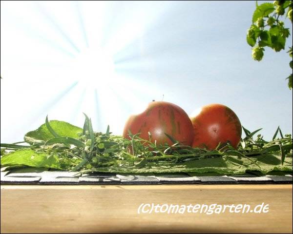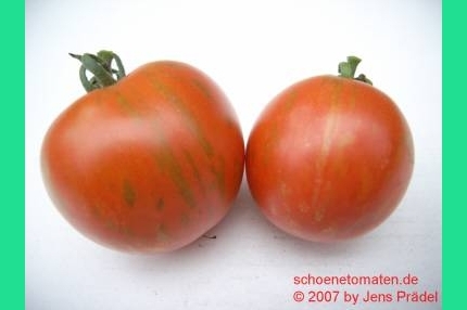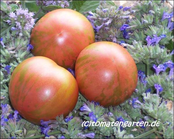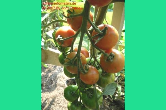 Striped Turkish - große (bis 2,5 m), schlank wachsende Pflanze mittelfrüher Erntebeginn (Mitte August) hoher Ertrag kleine bis mittelgroße (ø max. 5 cm und 50 bis 70 g), gleichmäßig runde, feste, hellrote Früchte mit zunächst grünen, bei Vollreife dann goldenen Streifen saftiger, leckerer Geschmack eine äußerst attraktive Sorte (Quelle: www.schoenetomaten.de)
