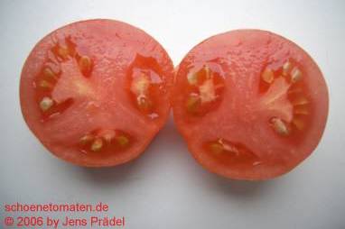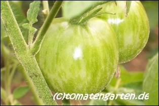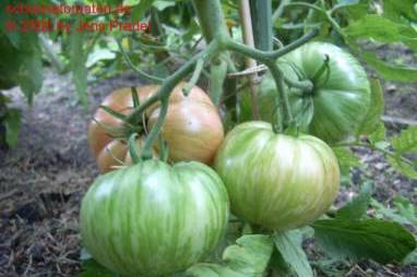 Small Pink Stripe - große Pflanze (2 bis 2,5 m) früher Erntebeginn (Anfang August) ordentlicher Ertrag relativ kleine, runde, nur leicht gerippte, pinkfarbene Früchte mit grünen Streifen (bei Vollreife: rote Früchte mit pinkfarbenen Streifen), nicht sehr fleischig größte geerntete Frucht: 178 g saftiger angenehmer Geschmack (Quelle: www.schoenetomaten.de)