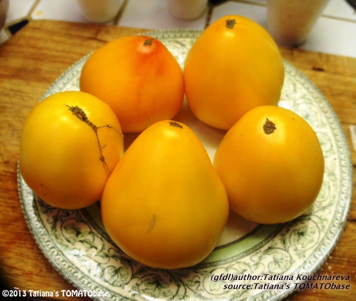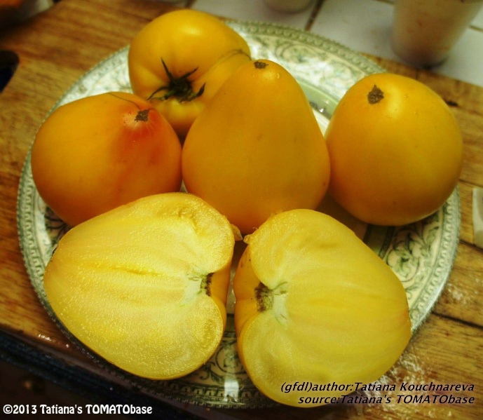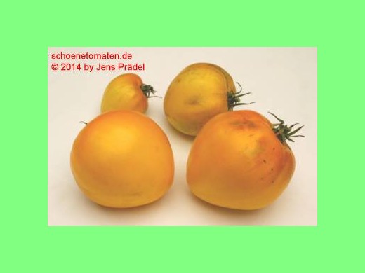 mittelgroße bis sehr große (ø 6 bis 10 cm, 7 bis 8,5 hoch), herzförmige, dunkelgelbe bis orangefarbene Früchte mit stumpfer Spitze