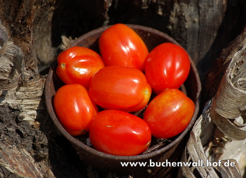 Ein Musterbeispiel an Widerstandsfähigkeit. 'Scatalone' ist eine typische Saucen-Tomate vom 'San Marzano'-Typ, wenig saftig mit viel Fleischanteil. Sie kann auch gut getrocknet werden. Der Ertrag ist sehr hoch, die Größe der Früchte variiert, je nach Standort und Düngung.