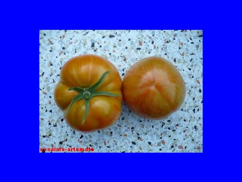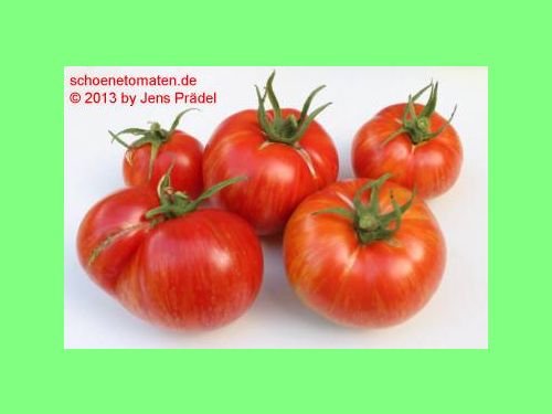 große (ø 6 bis 7 cm), 100 bis 150 g schwere, breitrunde, rot-orange gestreifte Früchte