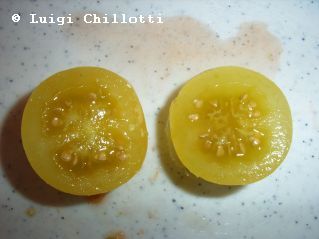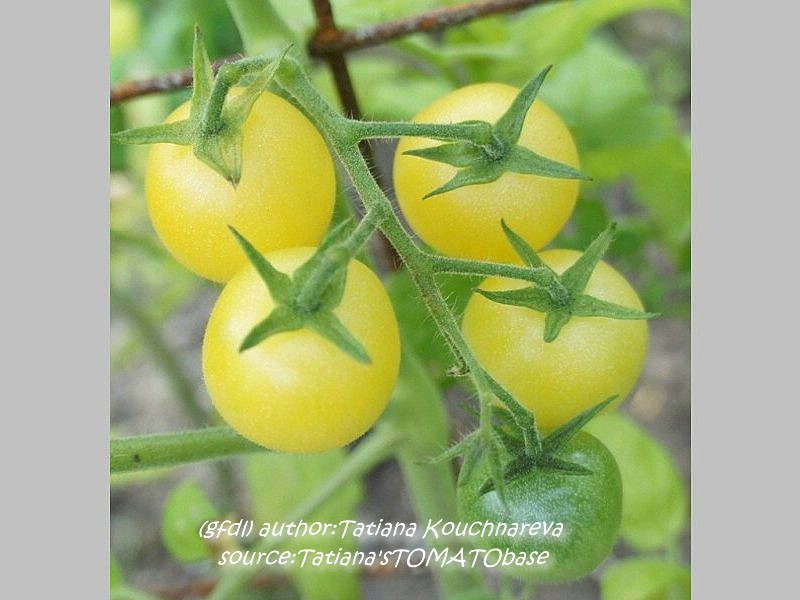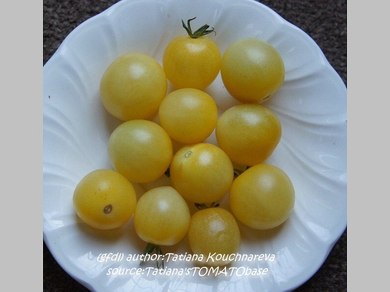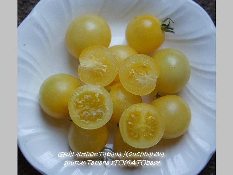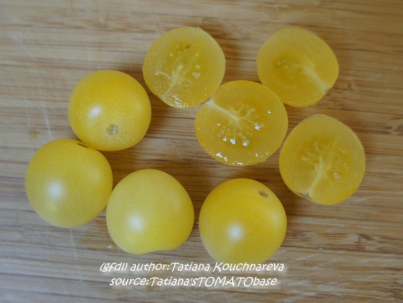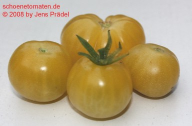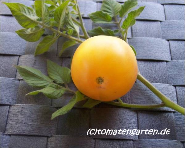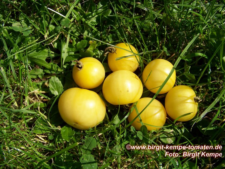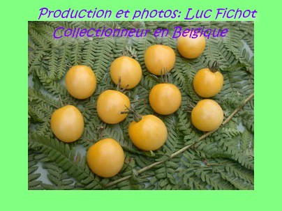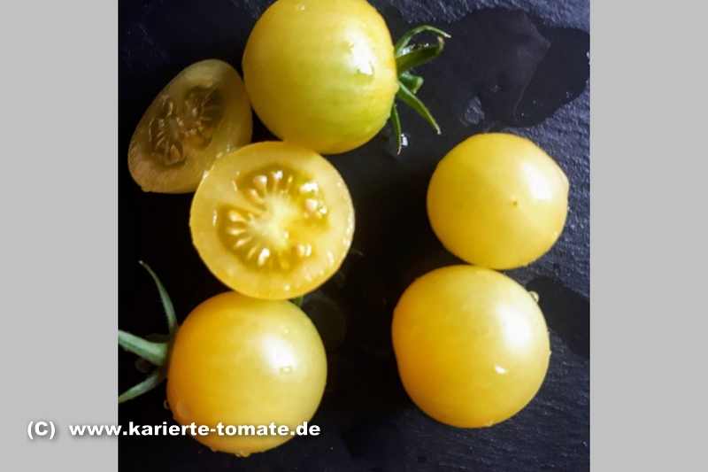 kleine (ø 3 cm und 15 bis 25 g), runde, nicht ganz platzfeste, dünnhäutige, hellgelbe Früchte