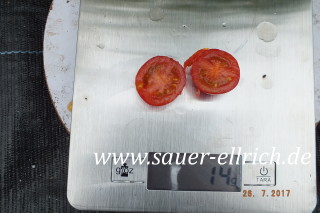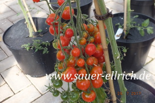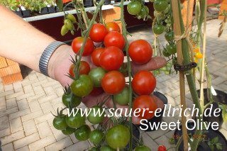 Meine Lieblingstomate!. Kein überragender Ertrag aber ein sehr guter süßer Geschmack. Platzt auch bei feuchten Wetter recht selten und ist dann immer noch gut zu essen. Hat eine feste Schale. Wird knappe 2 m hoch und ich baue sie jetzt seit 6 Jahren immer wieder im Kübel an. Das wird so bleiben!!