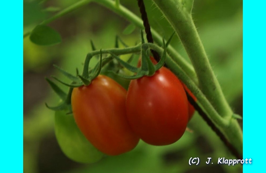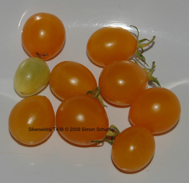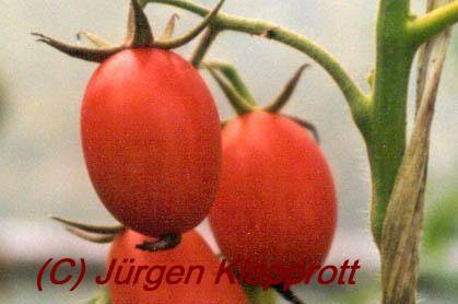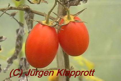 Bei mir (Bezugsquelle Bohl T438) war diese Sorte orange abreifend mit bis zu 200 Früchten an einer mehrfach verzweigten Rispe. Die Früchte haben durchschnittlich ein Gewicht von 7g je Frucht und größentechnisch eher als Cocktailtomate einzustufen