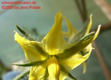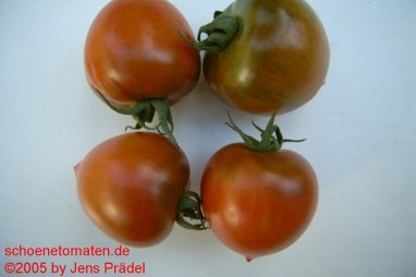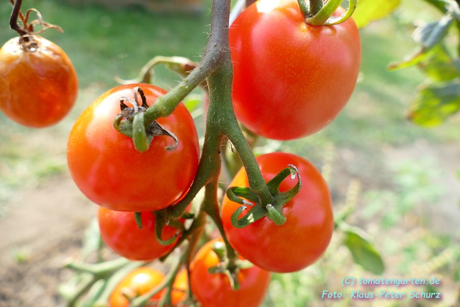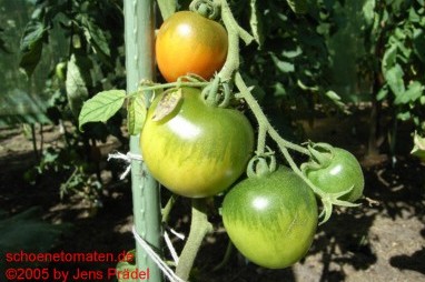 Santiam - kleine, begrenzt wachsende Pflanze (kleiner 1,5 m) später Erntebeginn (Mitte August) mittlerer Ertrag mittelgroße (60 bis 90 g), ovalrunde, rote, grünschultrige Früchte mit Spitze festes Fruchtfleisch, trotzdem saftig und angenehmer Tomatengeschmack (Quelle: www.schoenetomaten.de)