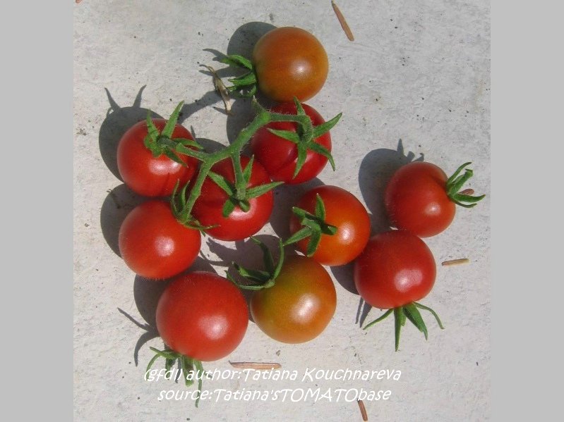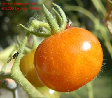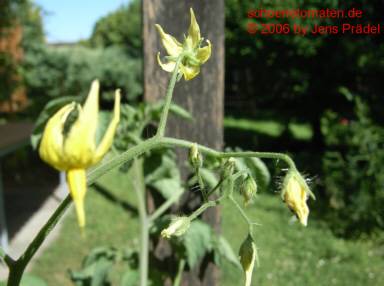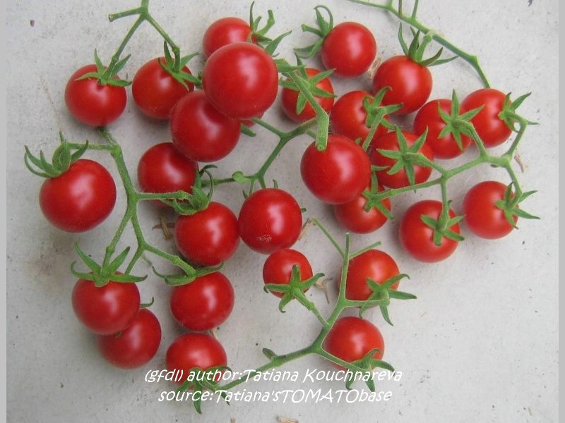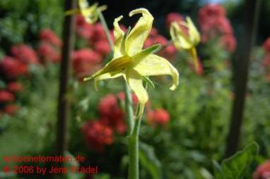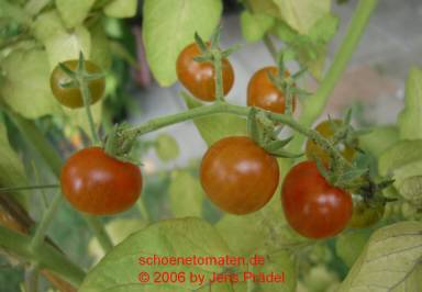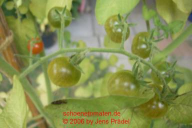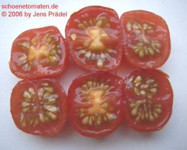 Sara's Galapagos - mittelgroße Pflanze (bis 2 m), lockerer, mehrtriebiger Wuchs mit vielen Verzweigungen später Erntebeginn (Ende August) Der Ertrag ist gering, spielt aber bei dieser Wildtomatenform keine Rolle. eine Unmenge an sehr kleinen (2 bis max. 3 g), breitrunden, in Draufsicht leicht ovalen, roten Früchte sehr lecker zum Naschen (Quelle: www.schoenetomaten.de)
