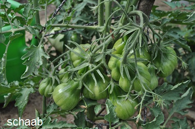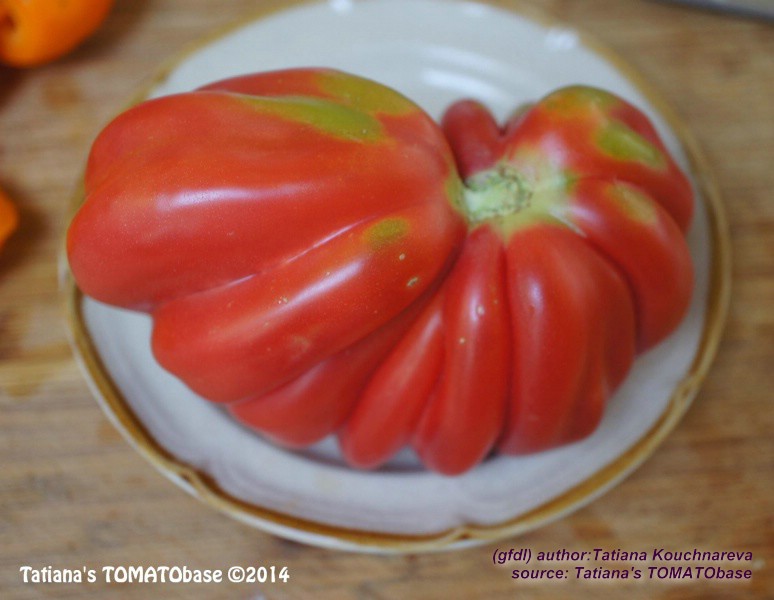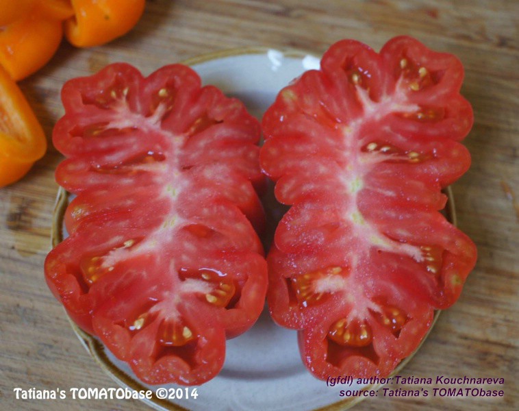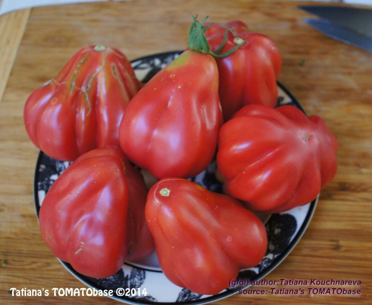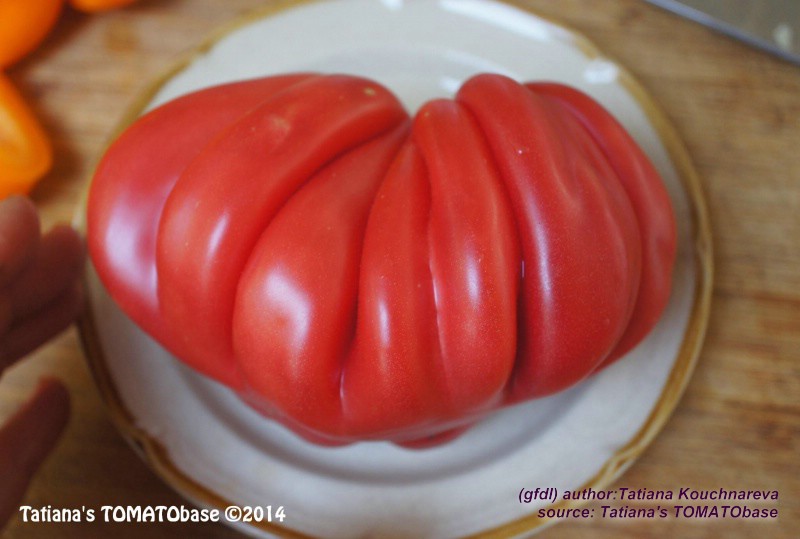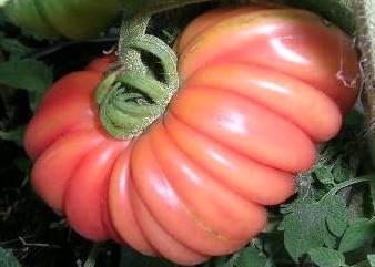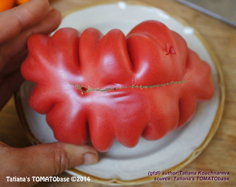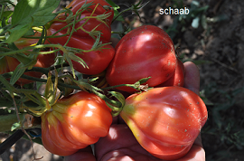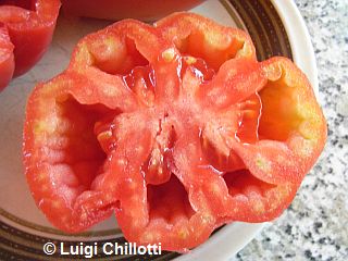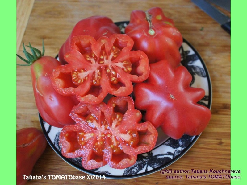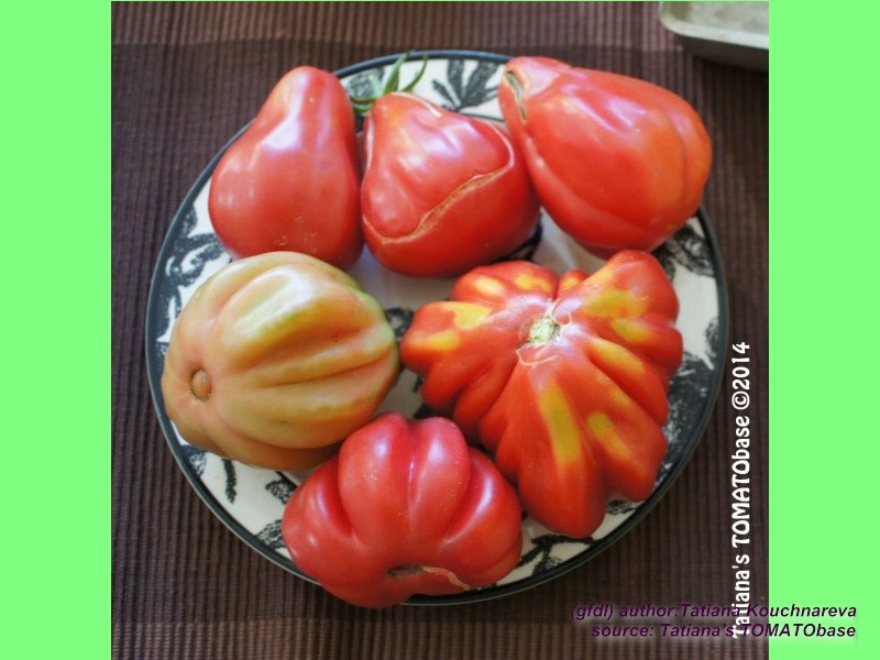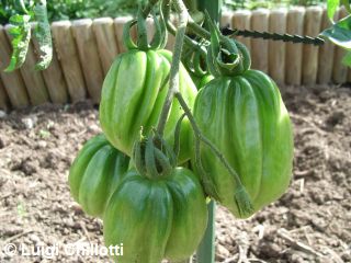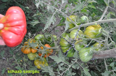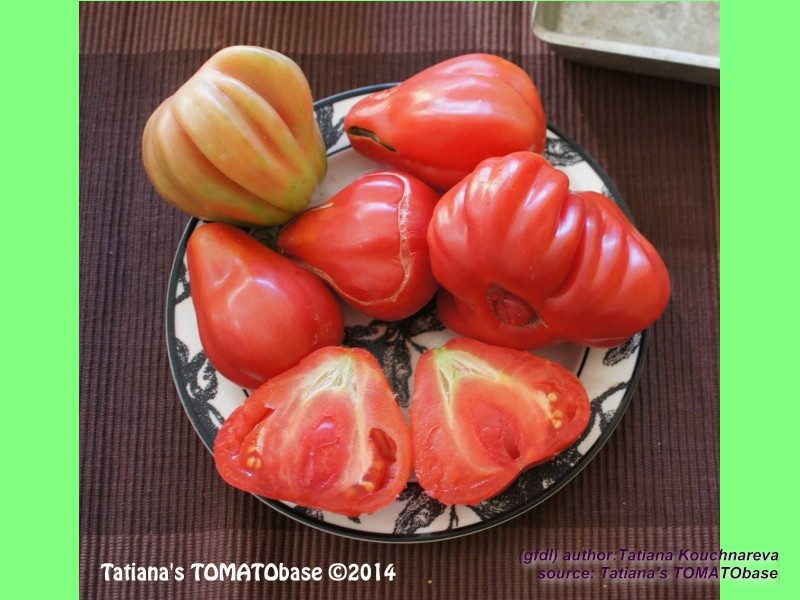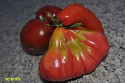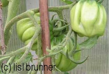 Tlacolula Ribbed - sehr große Pflanze (bis 2,5 m) später Erntebeginn (Mitte August) extrem ertragreich mittelgroße bis große, rote, stark gerippte, beutelförmige Früchte sehr würziger Geschmack, zum Schmoren ideal eher zu den Fleischtomaten zählend schwerste geerntete Frucht: 279 g (Quelle: www.schoenetomaten.de)