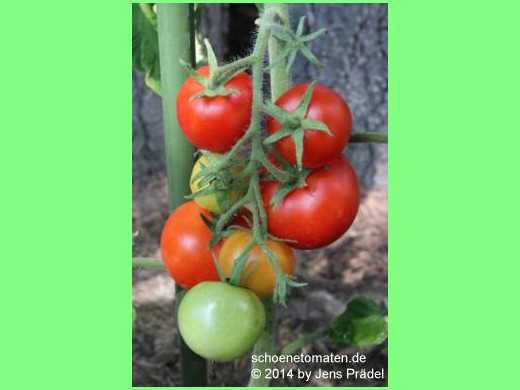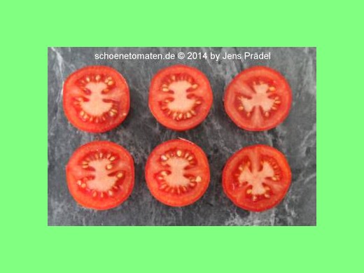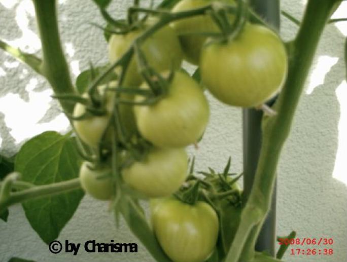 Angebaut 2022 im Gewächshaus, zweitriebig gezogen. Pflanze 2,50m hoch. Erste Ernte 22.07.. Früchte 60-70g schwer, Schale ziemlich fest. Gleichbleibend hoher Ertrag. Geschmacklich überzeugt sie mich eher nicht - säuerlich-fade.